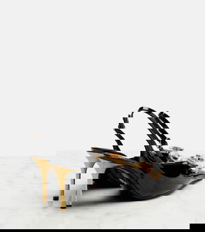 Embellished patent leather slingback pumps.