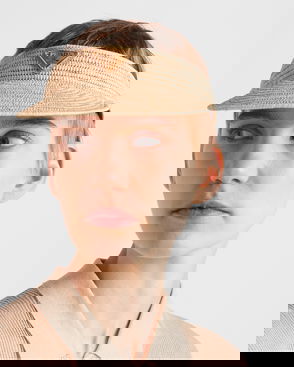 Prada crochet beret. Triangle geometric pattern, embroidered lettered logo, open work raffia-effect yarn.
