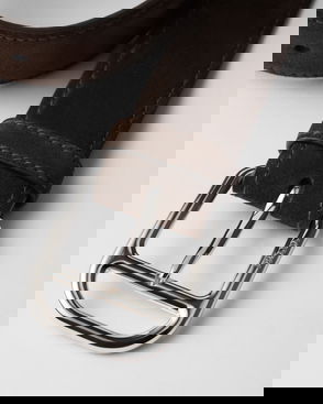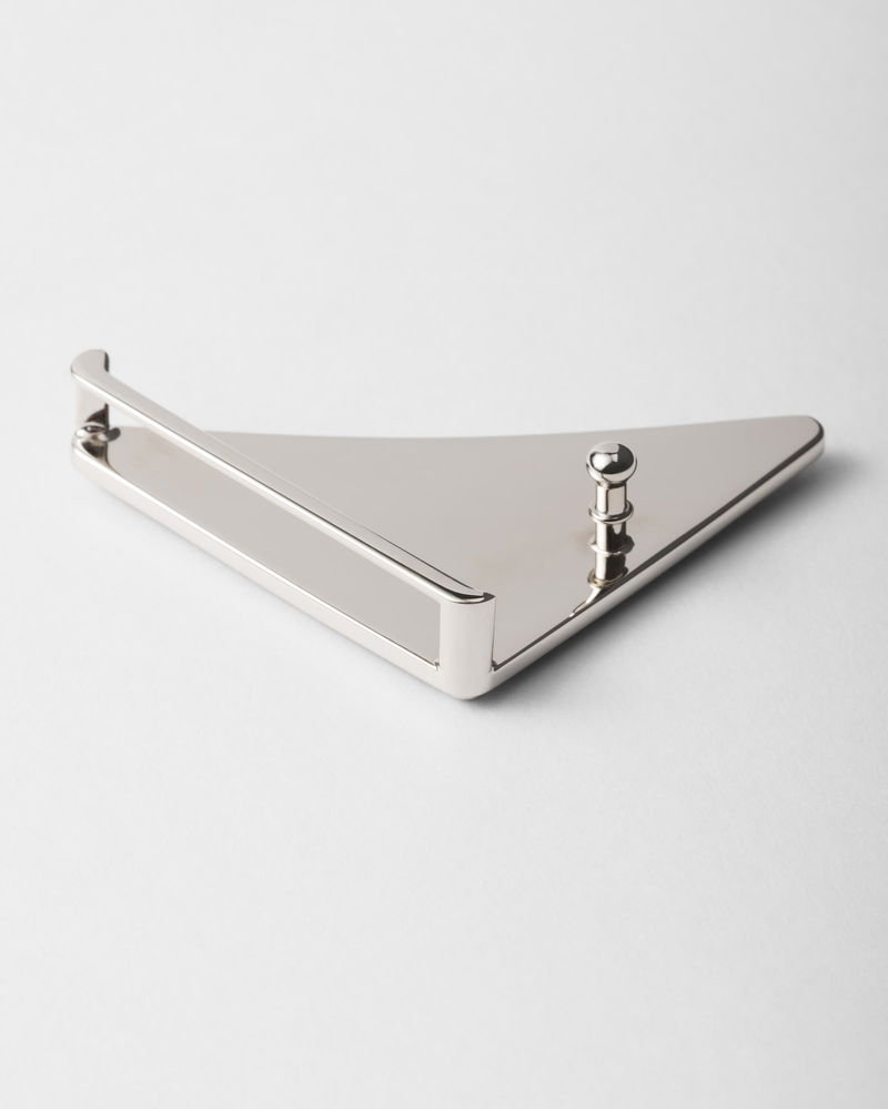 Enameled-metal triangle logo belt buckle.