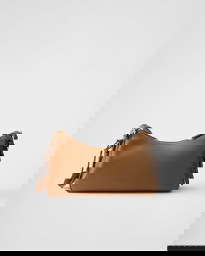 Slouchy shape, detachable and adjustable logo-print shoulder strap, two side flap pockets, front zip pocket, gold-toned hardware, enamelled metal triangle logo at front, one main compartment, one interior patch pocket, Re-Nylon lining