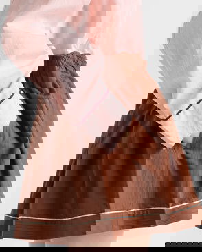 Prada infuses playful charm into this pencil skirt, adorned with a delicate floral motif on a blush-toned base. A contrasting ribbed-knit waistband adds a sporty twist, balancing femininity with the brand’s signature modern edge.