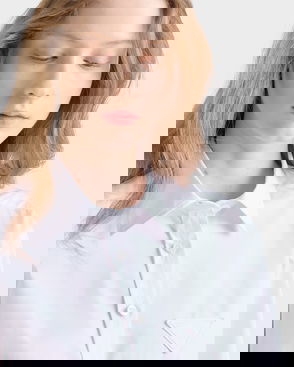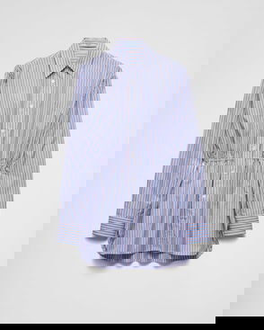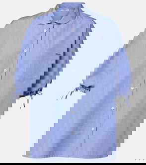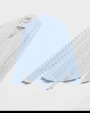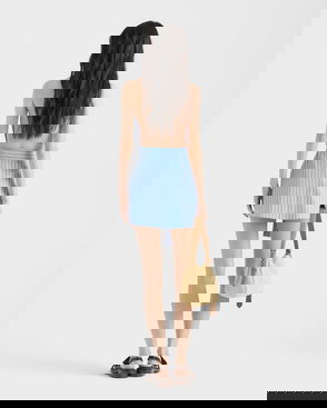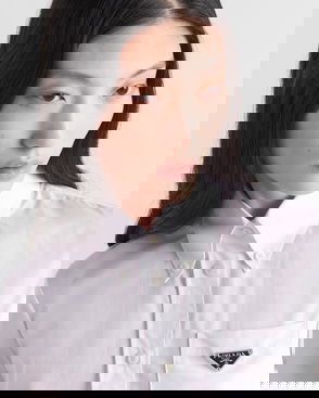 Prada's powder-blue blouse turns to reveal a row of buttons down the back in a subtle subversion of shirting styles. The airy cotton poplin is shaped with a high smocked neck, with feminine gathered shoulders adding softness to the silhouette. Style it with the matching skirt and chunky flat sandals to evoke a sunshine mood.