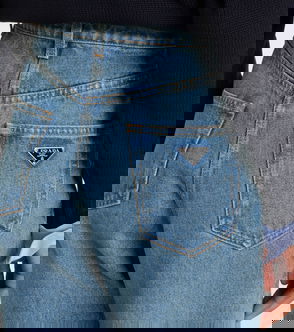 Prada looks to retro denim from the 1970s to inspire the flared silhouette of these indigo-blue jeans. Crafted in Italy with subtle fading effects, they're hallmarked with a signature triangular logo plaque in black and silver metal and Saffiano leather at the back pocket. Lead the eye to the flattering high-rise waist by tucking in a top.