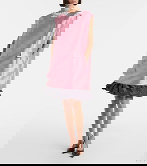 Prada wool-knit mini dress. Button fastening. Regular fit, collared, short sleeve, ribbed trims, houndstooth intarsia knit, gold-tone button embellishment, knit triangle logo, welt pockets on front, mini silhouette.