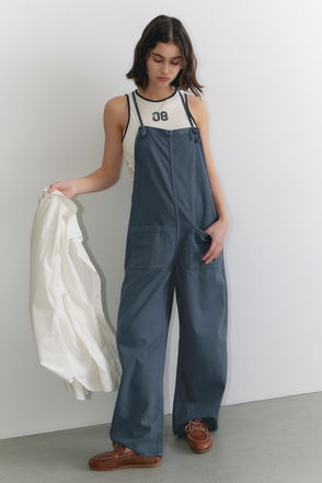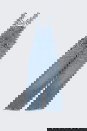 Prada denim dungarees. Exposed button and hook fastening. Relaxed fit, raw denim treatment, patch pocket on chest, enameled metal triangle logo on chest, contrasting topstitching, wide leg.
