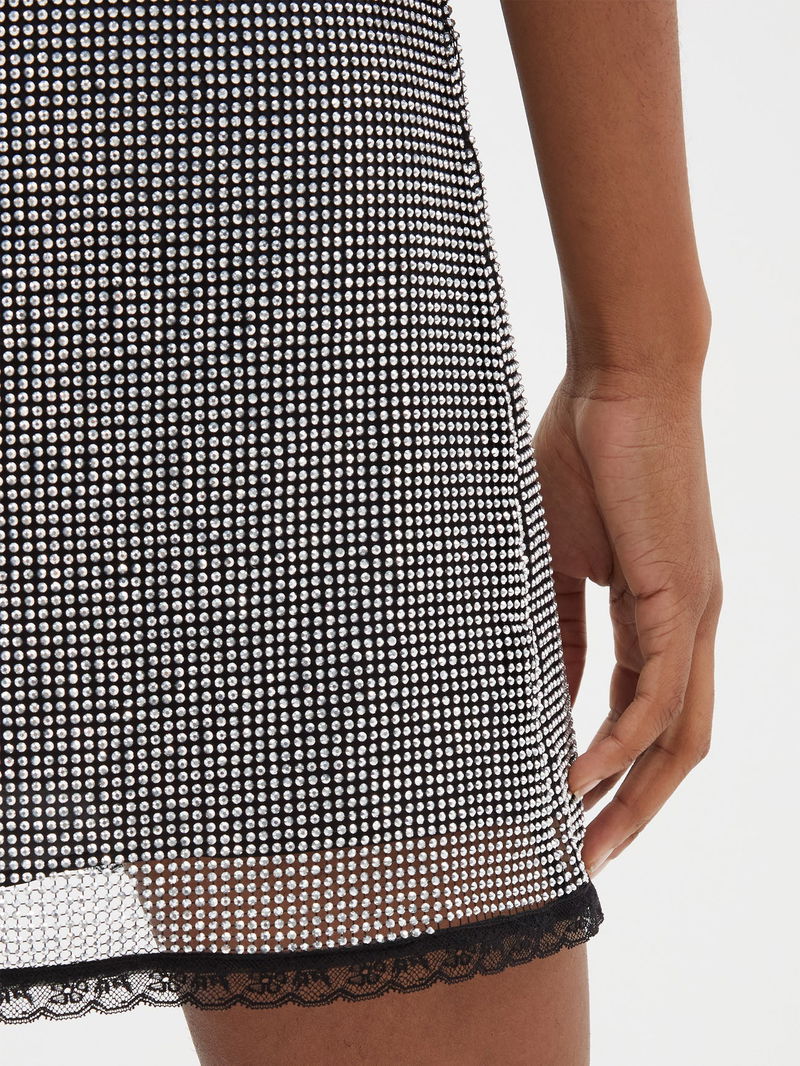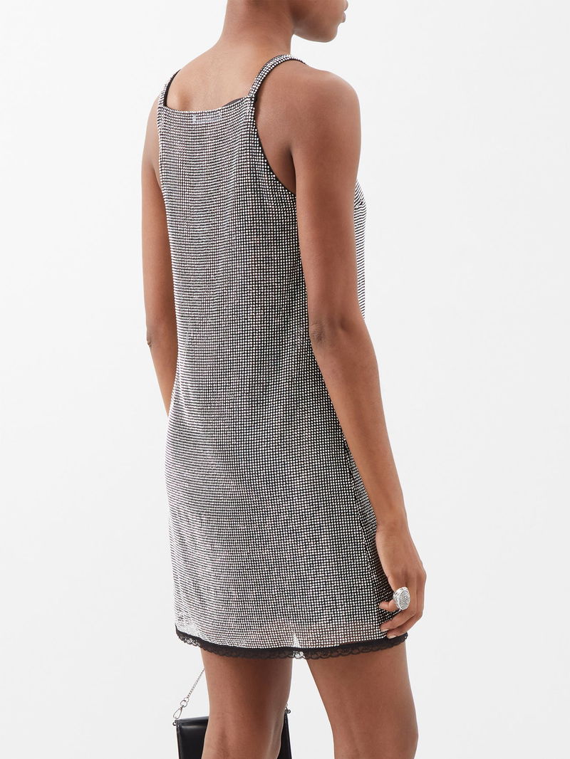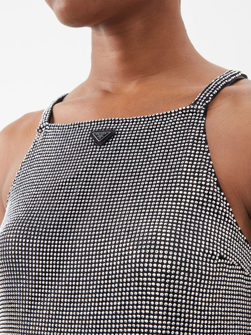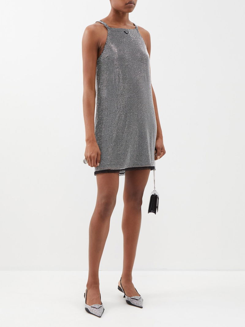 Prada cuts this silver mini dress from satin with shimmering crystal embellishments and a lace-trimmed hem, reflecting the label’s refined glamour.