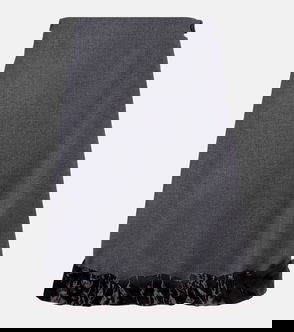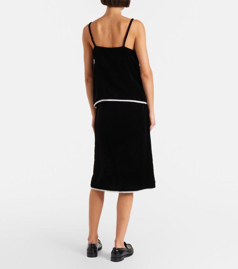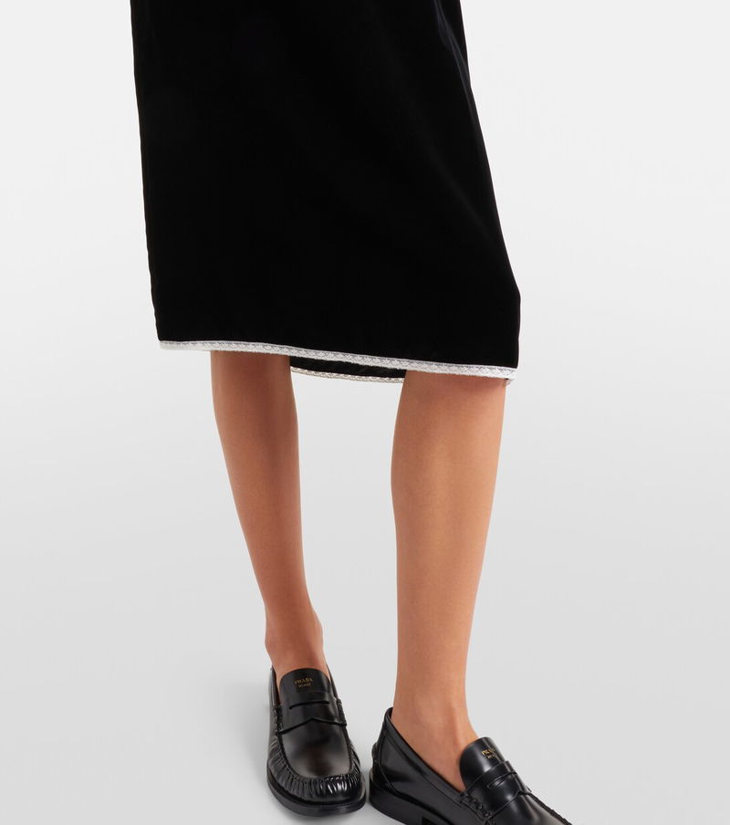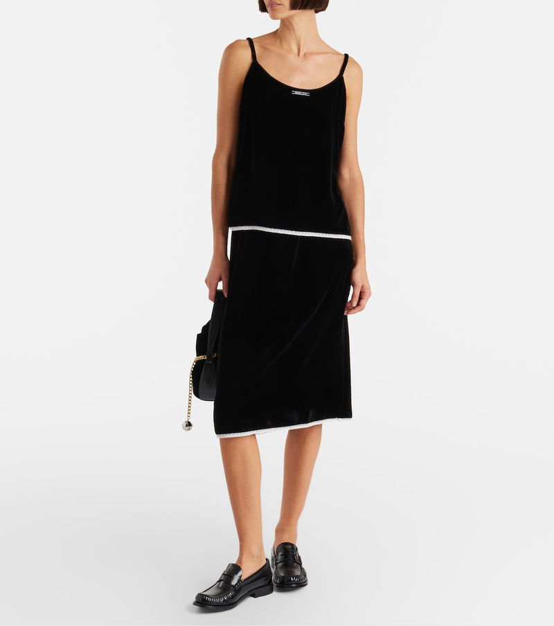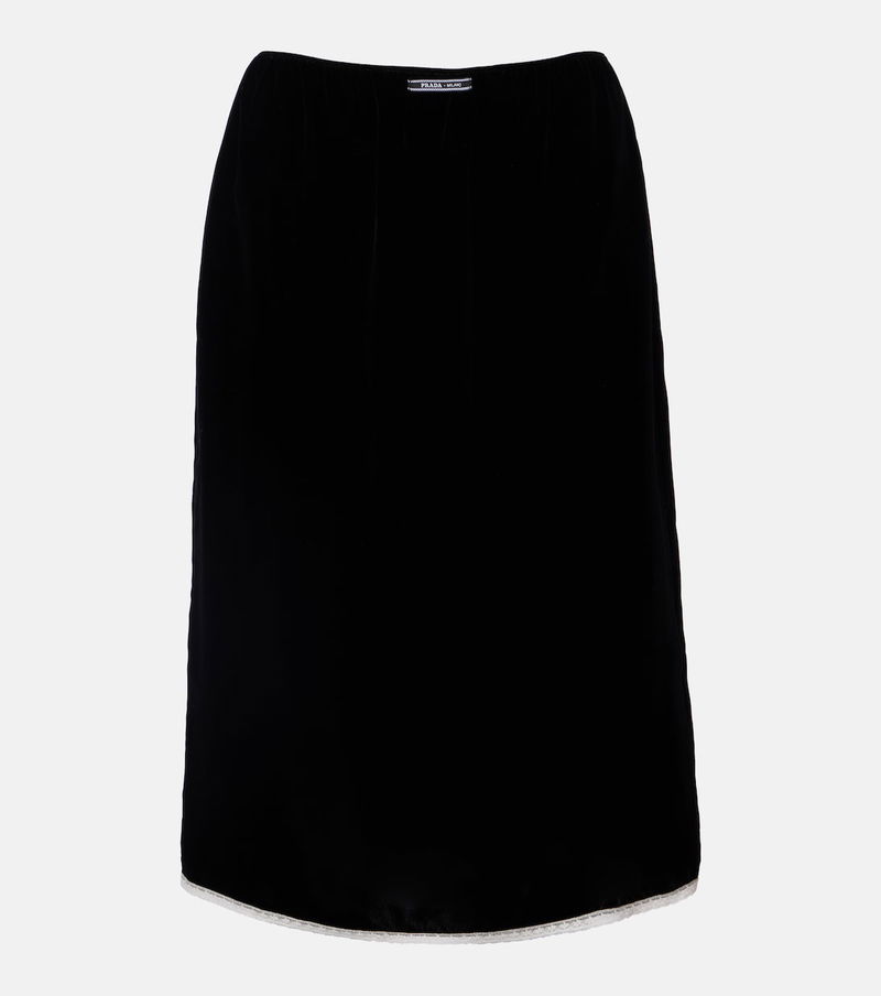 Prada embodies modern sophistication, blending timeless Italian craftsmanship with an innovative spirit. This dainty midi skirt is cut from soft velvet and features a delicate lace trim and a Prada label stitched in front.