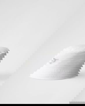 Prada recycled-nylon bucket hat. Bucket silhouette, enamel logo badge at the front, silver-tone hardware.