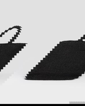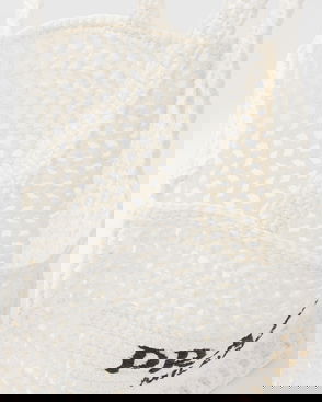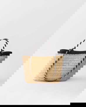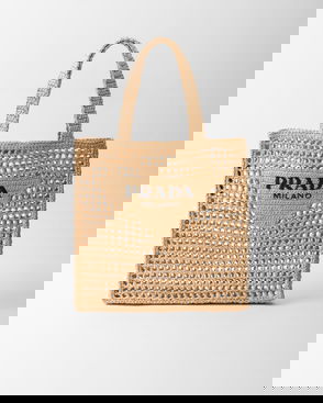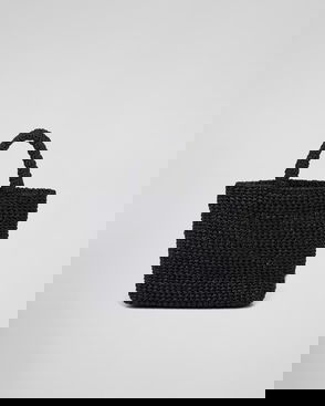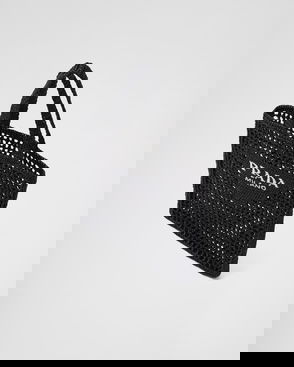 Prada crochet and leather tote bag. Boxy silhouette, double shoulder straps, double top handle, logo embroidery at the front, one main compartment, leather trims.