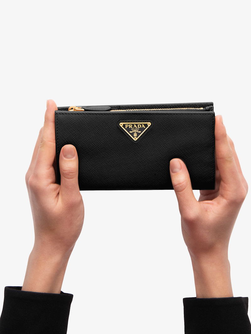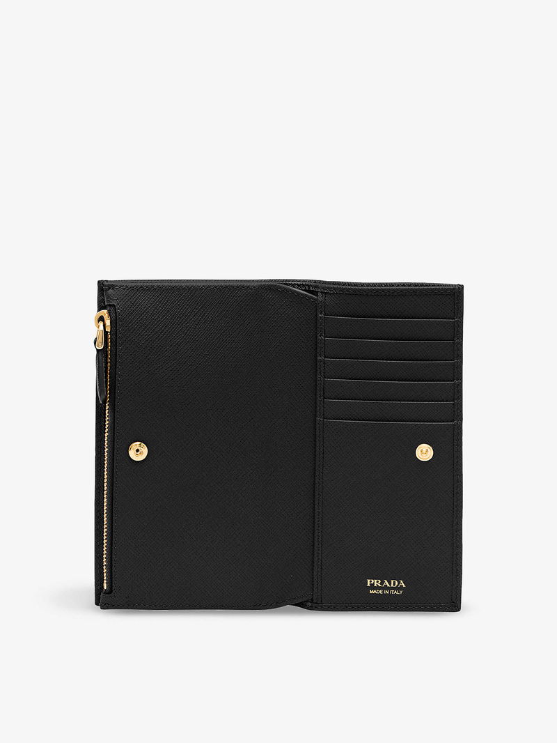 Selfridges Says: Prada earned its crown in the court of fashion by supplying Italy’s greatest monarchs of the early 20th century with gold-trimmed robes and fine leathers, and today, the label continues to honour its royal lineage with polished pieces like this wallet. Sculpted from buttery Saffiano leather to a slender, rectangular silhouette, it’s cut with a scattering of practical card slots and pockets. Then, for a final flicker of majesty, it’s crowned with the label’s triangular emblem in glistening gold-toned metal.