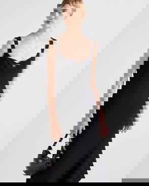 Prada redefines the codes of occasionwear for this black strapless dress, which is crafted from recycled nylon fibres sourced from purified waste textiles. The sculpted bodice is embellished with a triangular logo plaque and structured with internal boning, then puffs out to a voluminous circle skirt. Team it with chunky jewellery to complete a modern event look.
