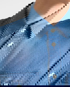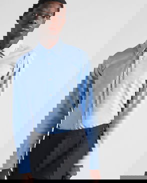 Prada denim shirt. Button fastening. Relaxed boxy fit, raw denim treatment, bowling collar, short sleeves, contrast stitching, patch pocket on chest, enameled metal logo triangle on pocket, straight hem.