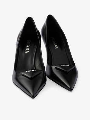 Prada leather slingback heels. Slips on. Closed pointed toe, metallic logo plaque, tapered silhouette.