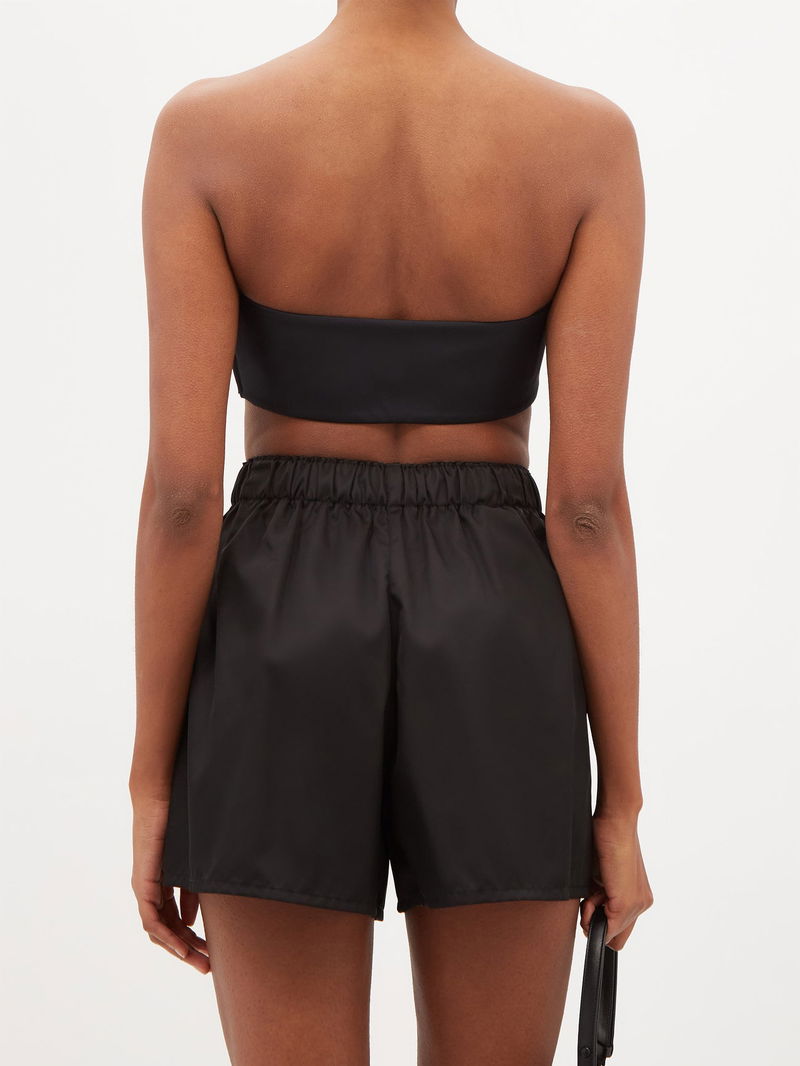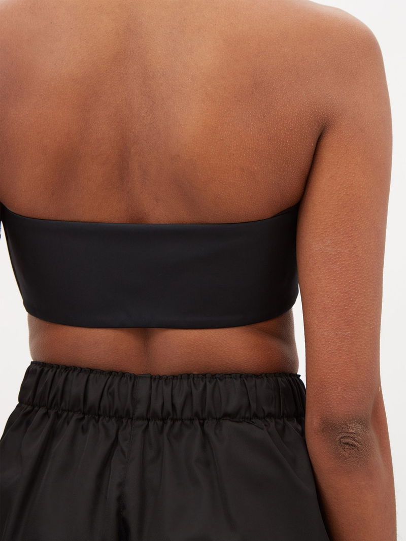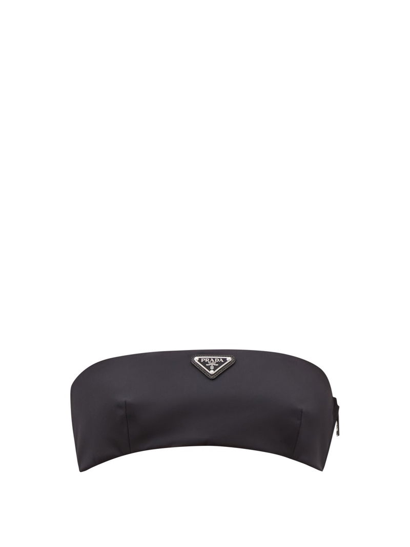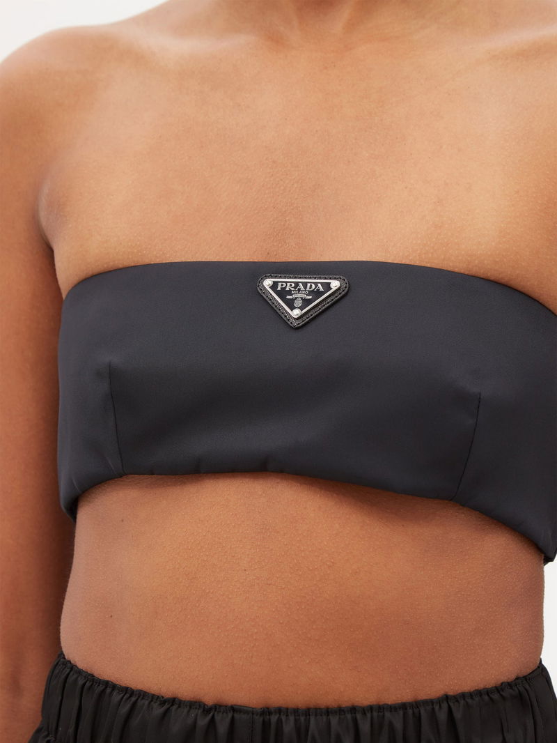 Prada’s black bandeau top is made from recycled nylon fibre derived from fishnets and plastic ocean waste and is hallmarked with a triangular logo.