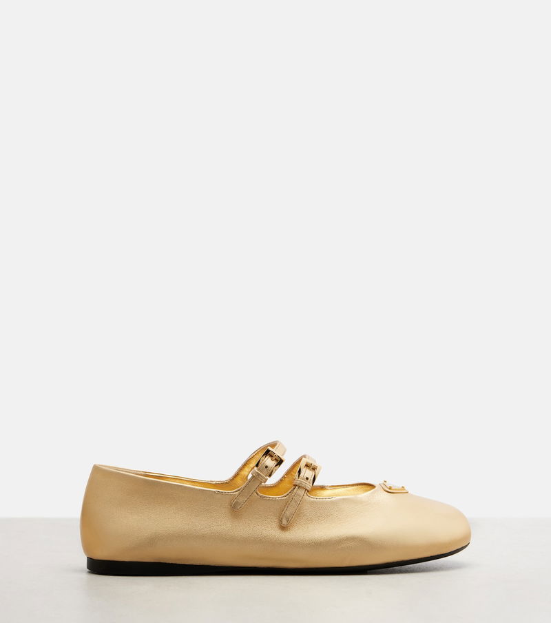 Made from metallic leather, these Mary Jane flats from Prada will be the focal point of any ensemble. They feature sleek profiles alongside double straps, and are detailed with the house's enameled triangle logo.