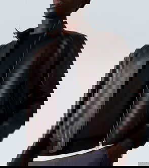 Prada leather jacket. Zip fastening. Oversized, long sleeves, ribbed collar, ribbed trims, silver-toned hardware, two popper-fastening pockets on front, triangular zipped pocket on sleeve with branded plaque.