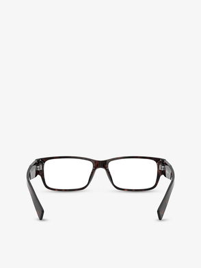 Prada acetate eyeglasses. Style number: PR 20ZV. Clear lens, logo badge at the side, gold-tone hardware, tortoiseshell. Frame shape: cat-eye.