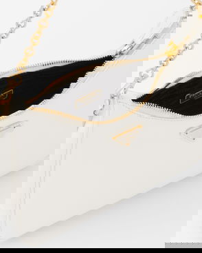 Prada's Re-Edition shoulder bag reprises the house's 2005 archival design in cross-hatched saffiano leather. The white style has a tuck-and-go compact silhouette, detachable golden chain handle, and adjustable web strap. The removable pouch and keychain are practical features that Prada fans will love.