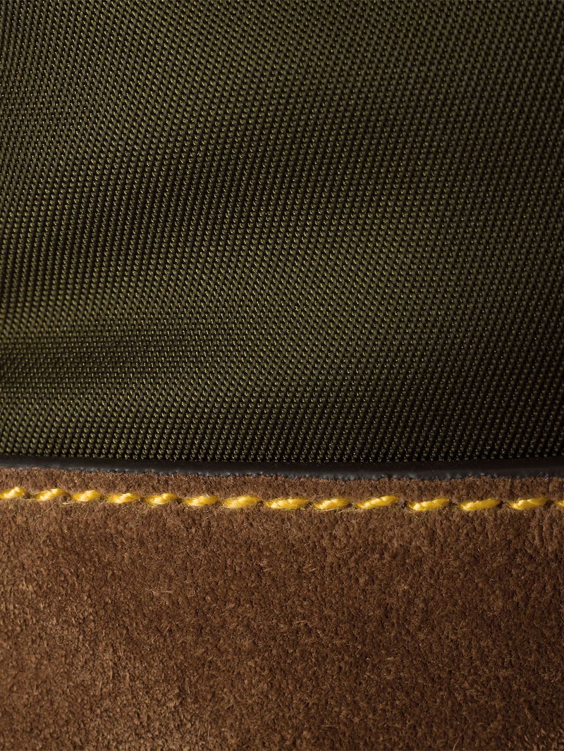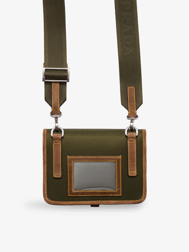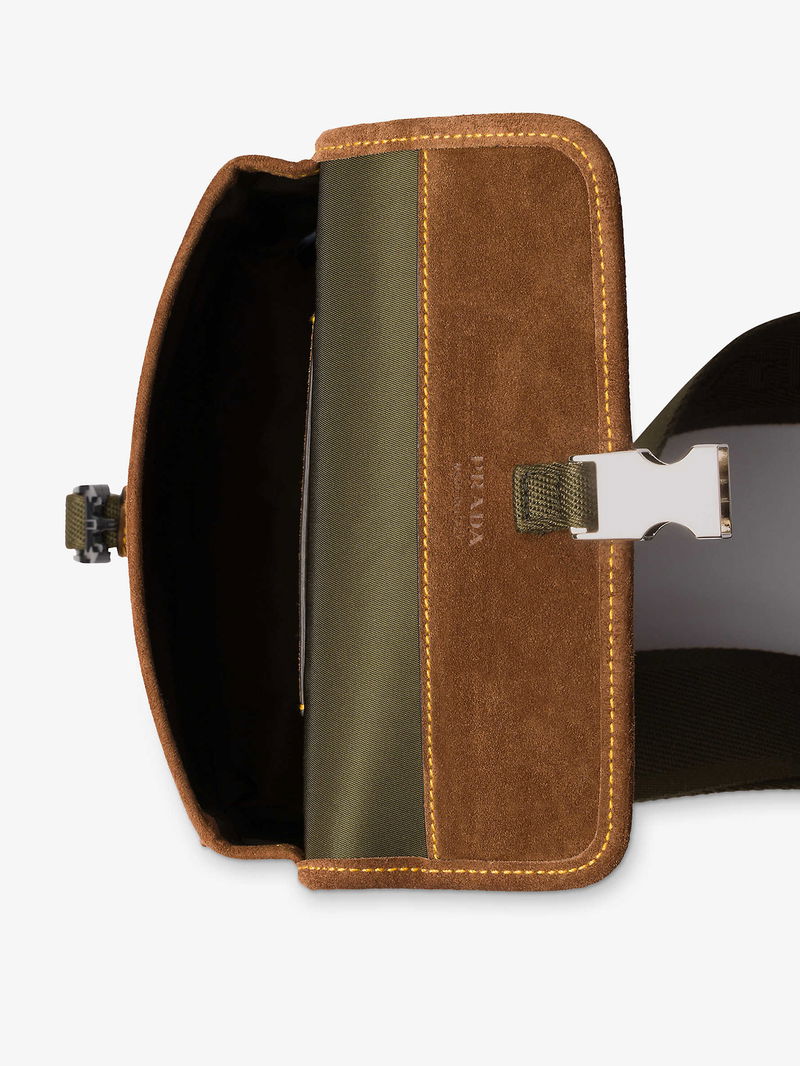 Prada nylon and suede smartphone case. Buckle closure. Adjustable strap, enamelled triangle logo, one card slot, contrast leather trims, polished hardware.