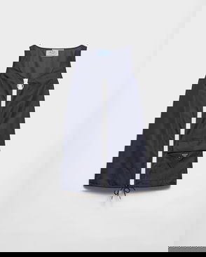 Trapeze shape, square neckline, enamelled metal triangle logo, inseam pockets, unlined, mini length
