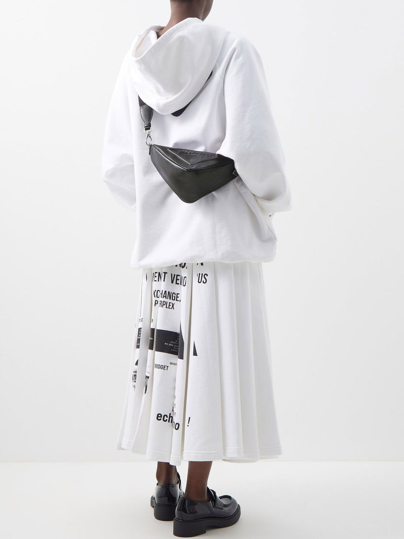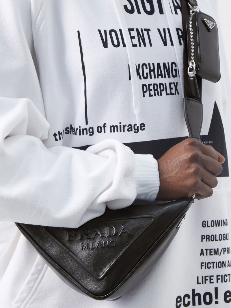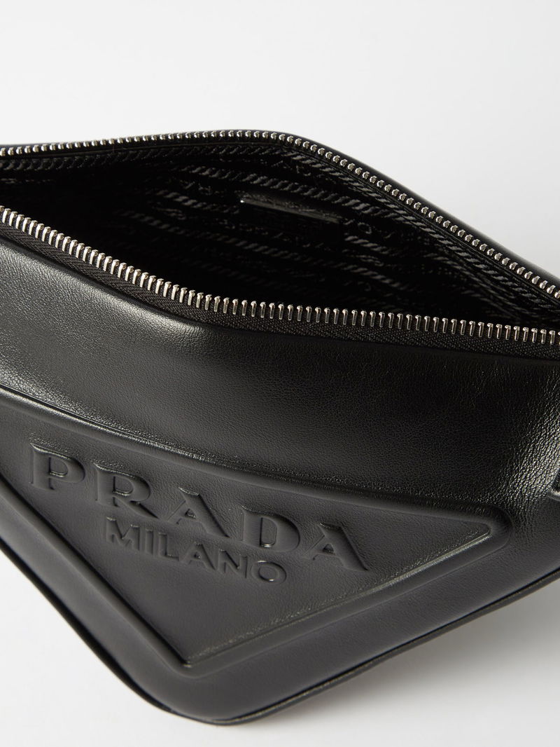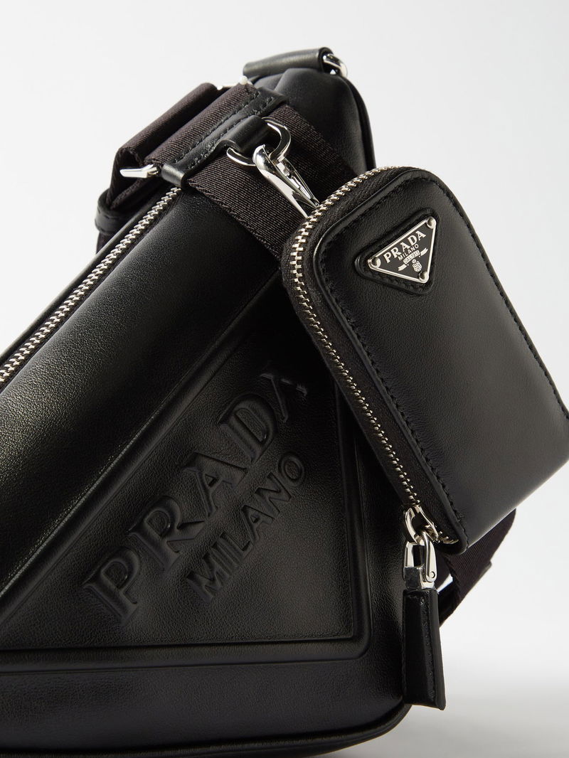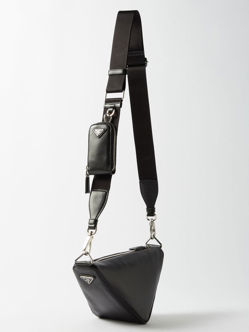 Prada shapes this black leather cross-body bag to a 3D version of its signature triangle logo plaque, set on a wide canvas strap for an adjustable length.