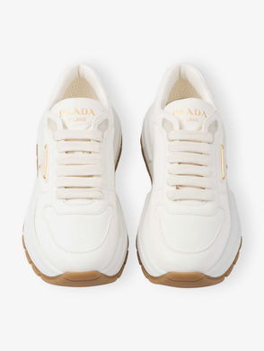 Prada’s white Wheel trainers are adorned with detachable zipped pouches – a recurring feature seen throughout recent collections which spotlights the house’s affinity for utilitarian tropes. They’re crafted in Italy from Re-Nylon gabardine with black rubber logos and silver hardware, then lined with smooth leather. Note the distinctive rubber sole embossed with a tyre tread motif.