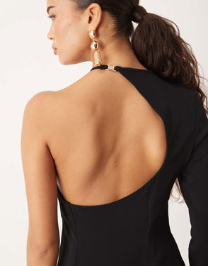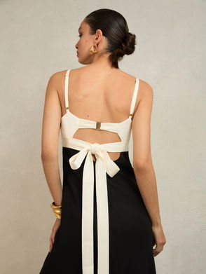 Prada’s black dress is crafted in Italy from recycled nylon that sees the house’s signature fabric woven from regenerated plastics, sourced from fishing nets and landfills. The slim-fitting scoop-neck bodice features a zipped front and a silver triangle logo plaque, then a buckled belt nips in the gathered waist and flutes the skirt to an undulating finish. Wear it over a white shirt to evoke a preppy sensibility.