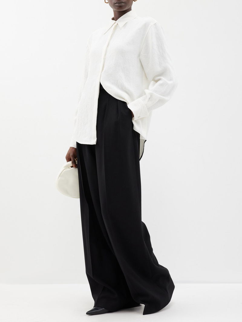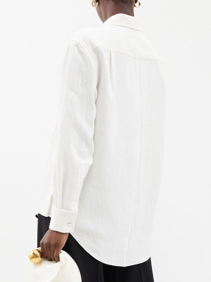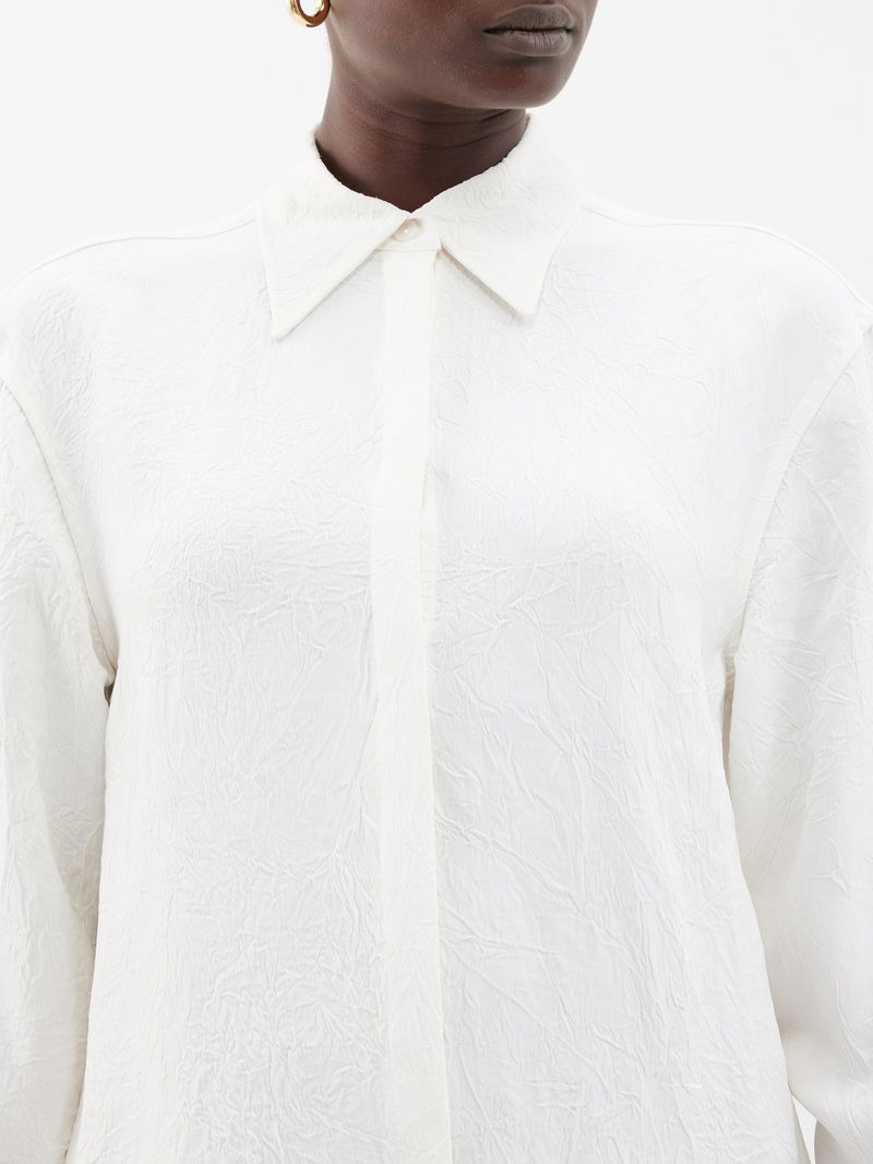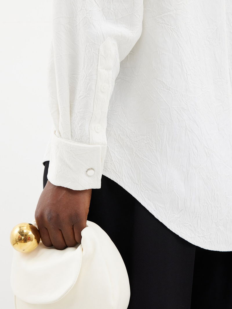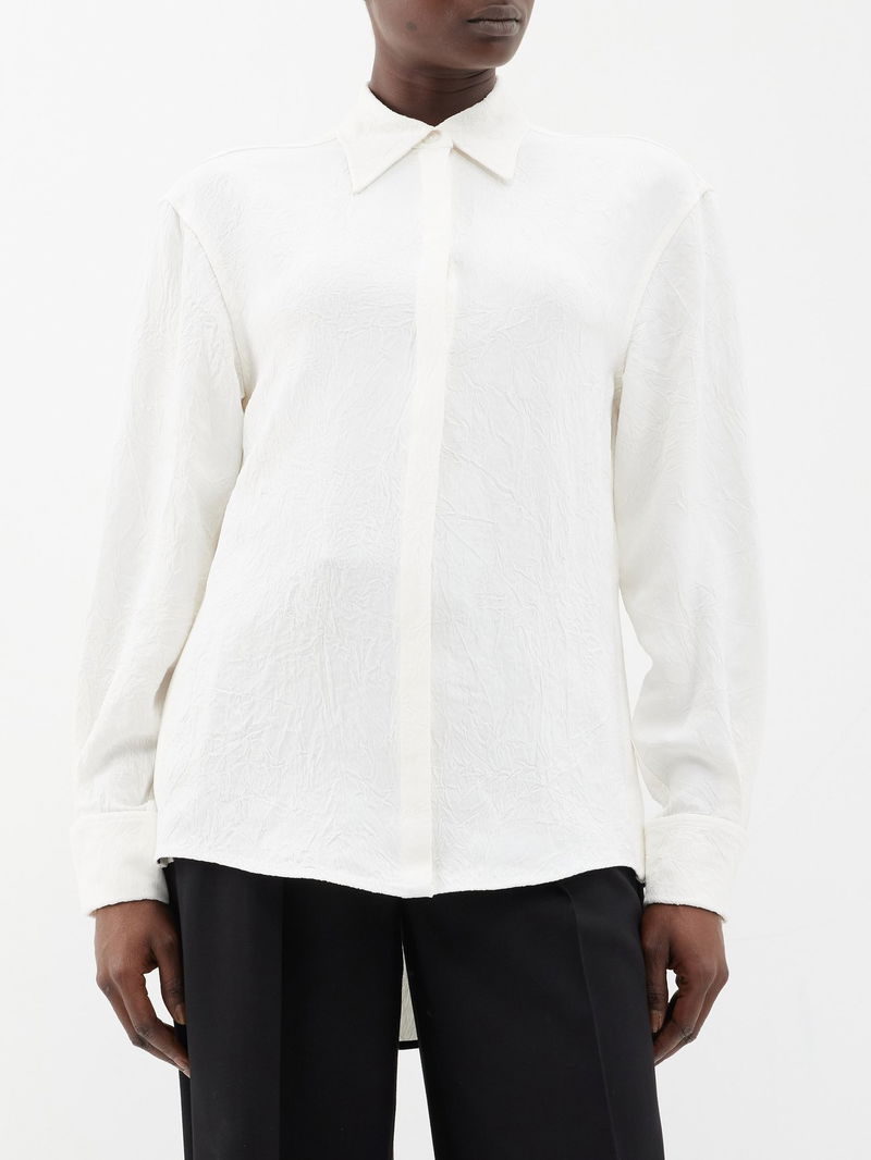 Chloë Sevigny opened Proenza Scouler’s AW23 runway in a black blazer layered over this white shirt, made from crushed matte-finish satin.