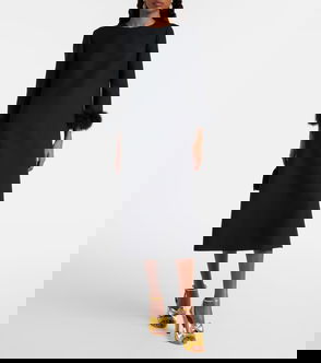 Proenza Schouler’s brown dress, seen in the Pre-AW20 lookbook, is cut with a high neck back tie and cropped gigot sleeves that bring a vintage sensibility to the silhouette. It’s made from crepe printed with painterly black and beige feathers and accented by hammered-gold buttons on the cuffs and belt tab. Underpin the eclectic pattern with coordinating-hued accessories.