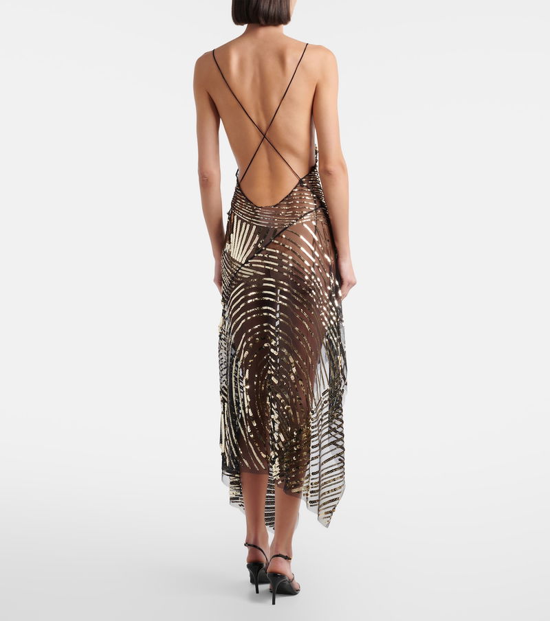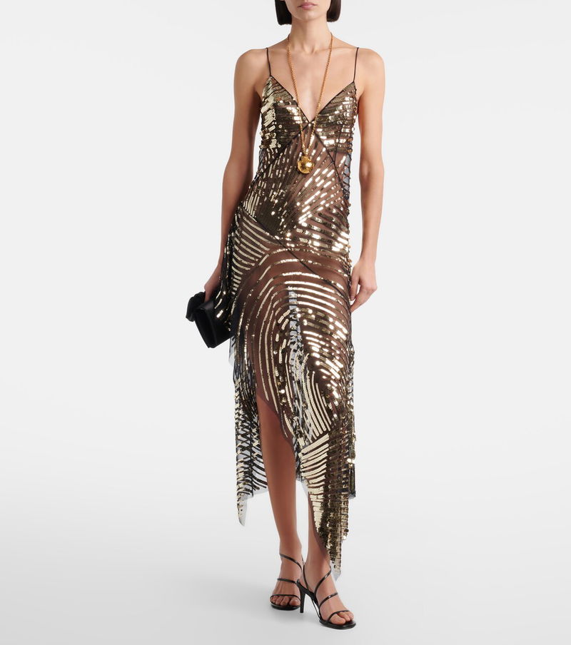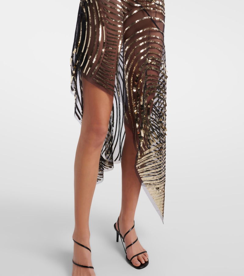 Exude glamour with this slip dress from Pucci. The piece boasts a semi-sheer tulle construction with an asymmetrical hemline, complemented by dazzling all-over sequin embellishments.