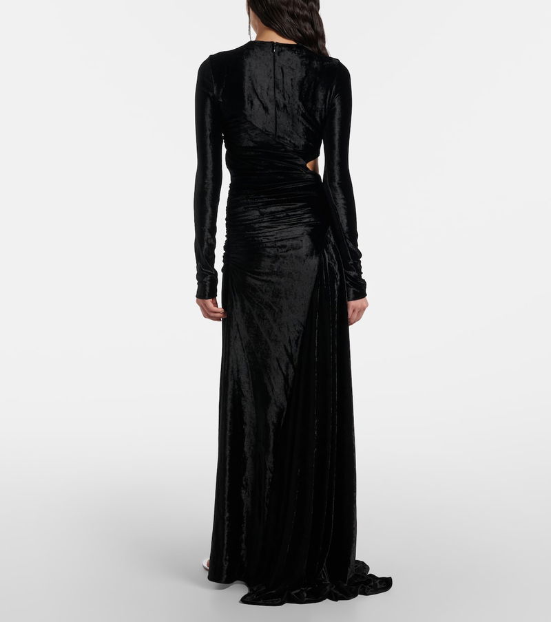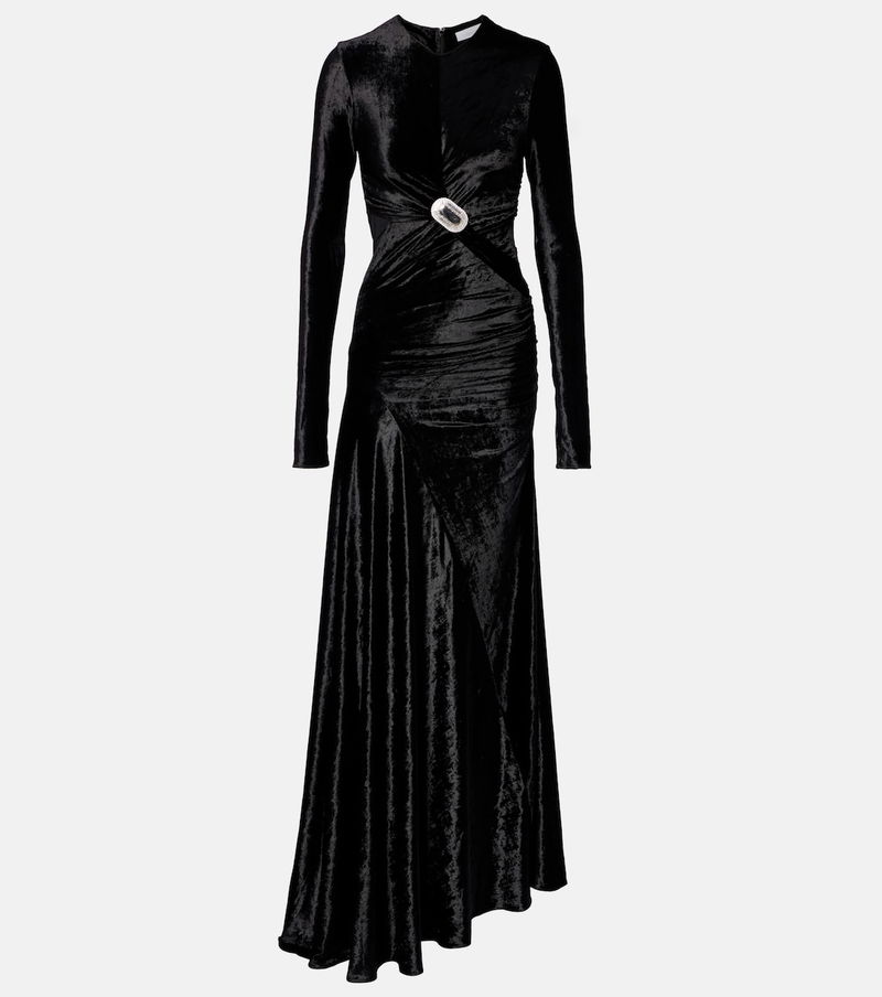 Rabanne’s innovative spirit is celebrated for its glamorous designs. This long-sleeved gown is crafted from plush velvet and features an asymmetrical drape held by an embellished brooch.