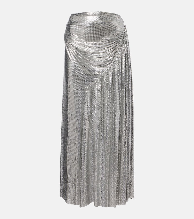 Celebrated for creating glamorous designs with unexpected materials, Rabanne’s innovative spirit continues to break boundaries. This chainmail maxi skirt is entirely crafted from fluid metal mesh in a shiny silver tone and features elegant draping.
