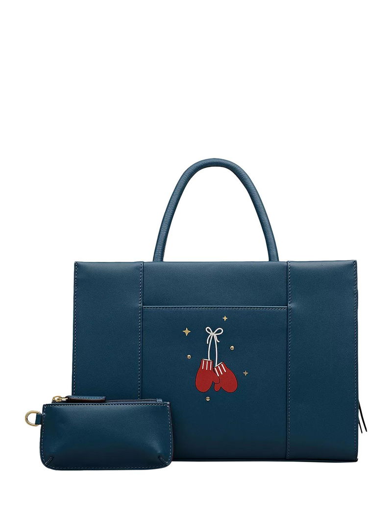 The coveted three compartment style features a wintry scene brought to life using leather appliqué, screen prints, foil embossing and mini studs that adorn the trees like festive lights.