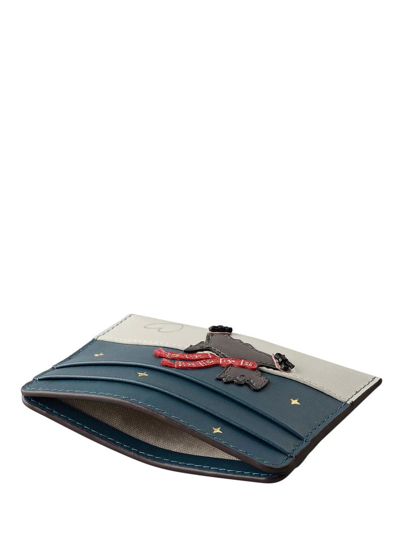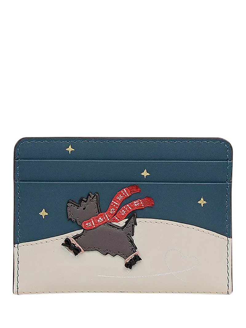 An appliquéd ice-skating Scottie dog decorates Radley's Christmas cardholder. Designed to match the collectible picture bag, this smooth leather shape features a snapshot of the same festive wintry scene, brought to life using screen prints and foil embossing.