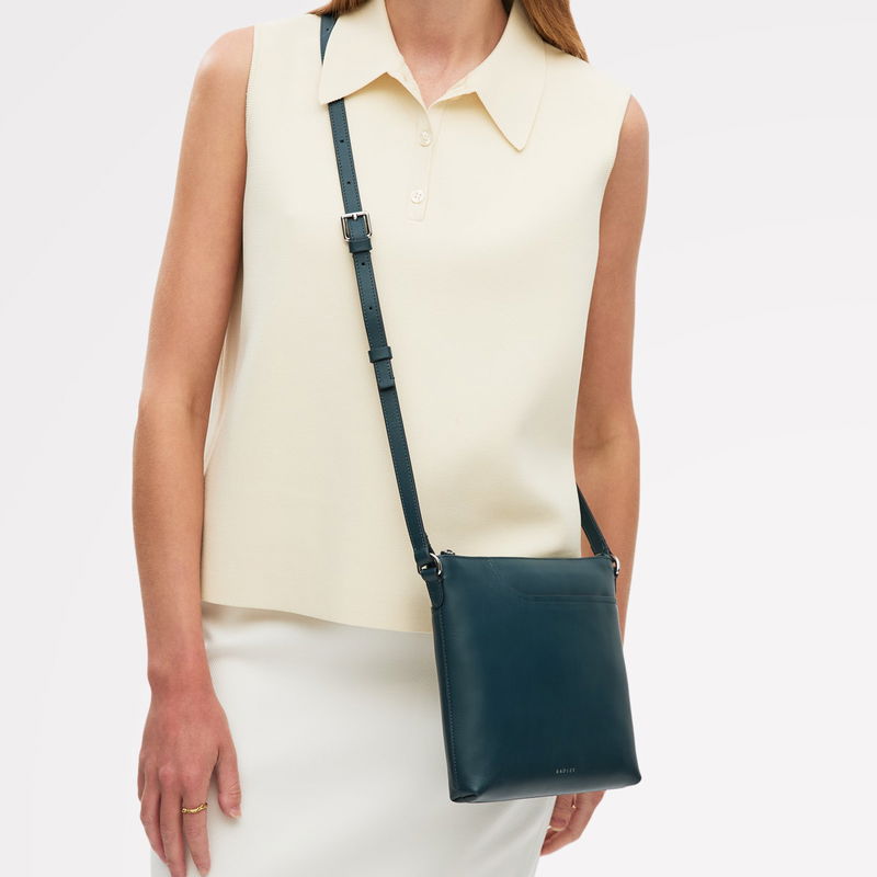 Pockets Leather Small Ziptop NS Cross Body Bag In Teal