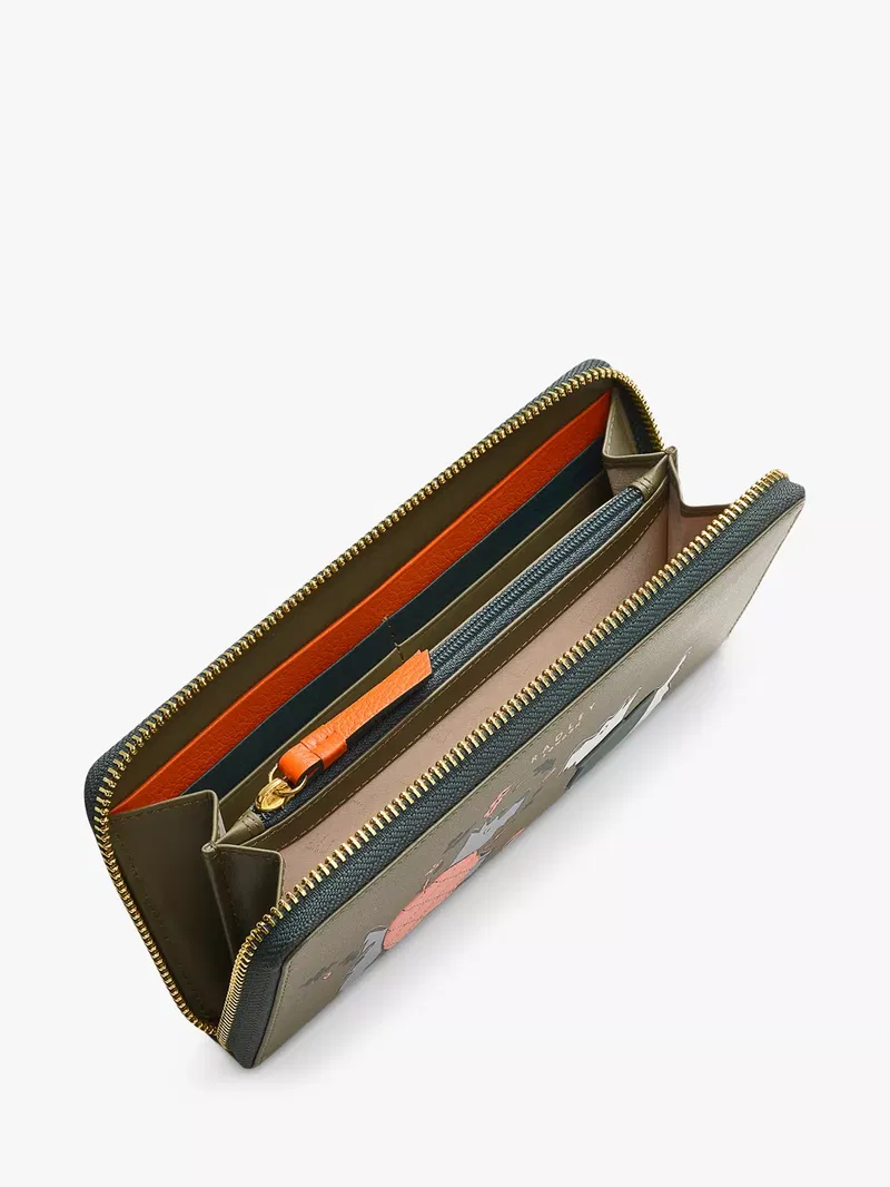Puffer coats are a big trend this season. So big, even Scottie is taking note. Spot him and a friend playing in the leaves, wrapped in their very own puffy jackets (crafted with padded, raised leather) on this large matinee purse. Designed with screen print leaves and contrast colour card slots inside, to ensure it has both charm and practicality. Features 12 internal card slots, 2 note compartments, central zipped coin pocket, and 2 slip pockets.