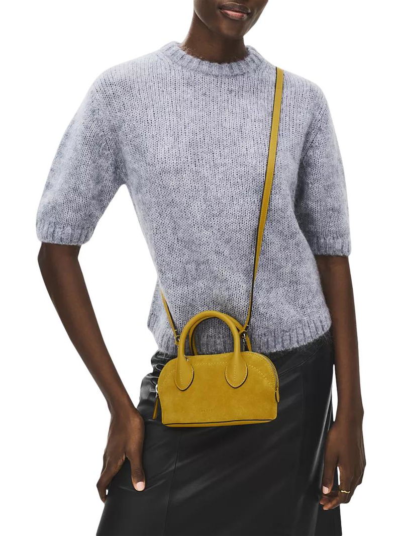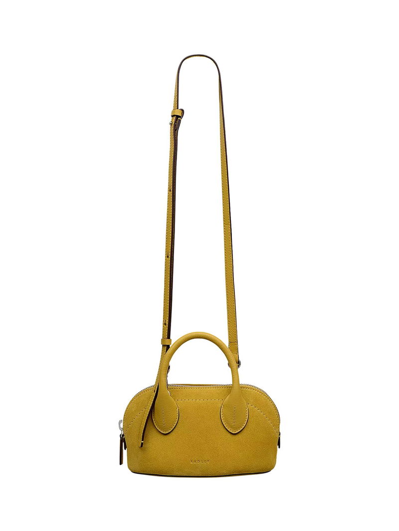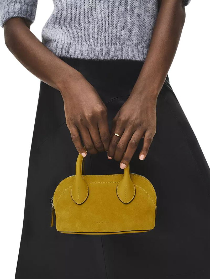 It's the season for the micro bag. Another compact shape, The Muriel joins Radley's collection with coveted miniature proportions and exaggerated features, such as the large handle tabs and the chunky zip fastening. A mini bowling bag shape, crafted in soft Italian suede with the brand's new heritage mark detailing tucked inside.