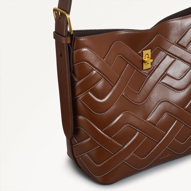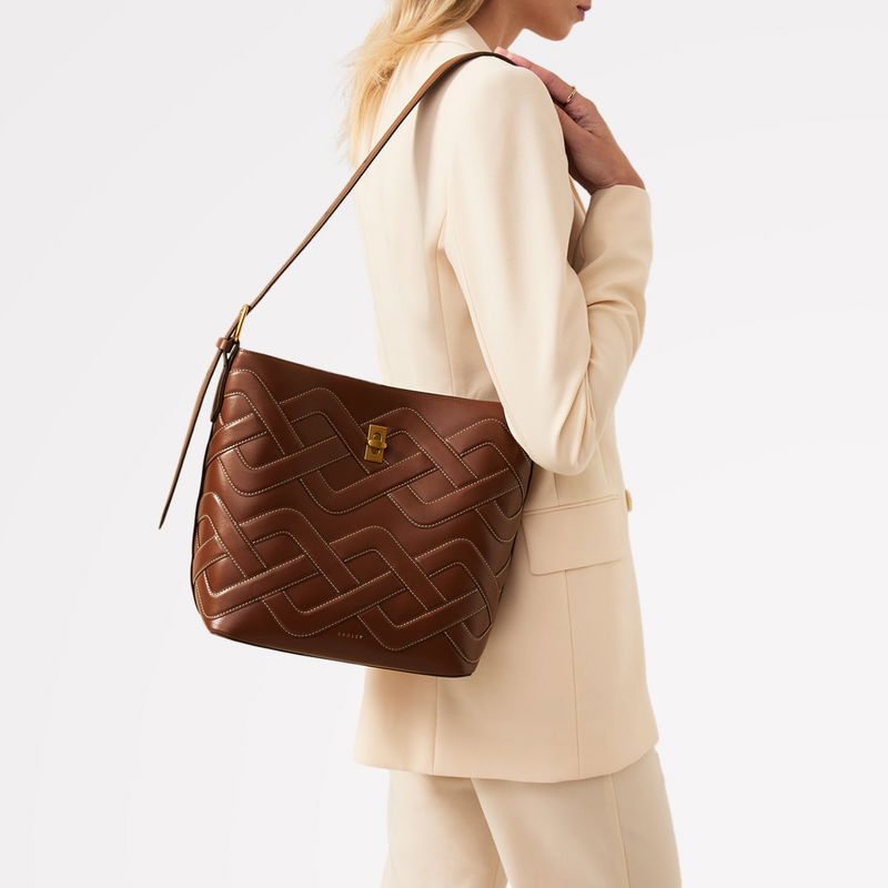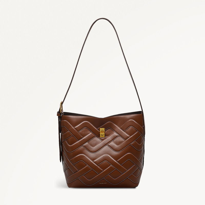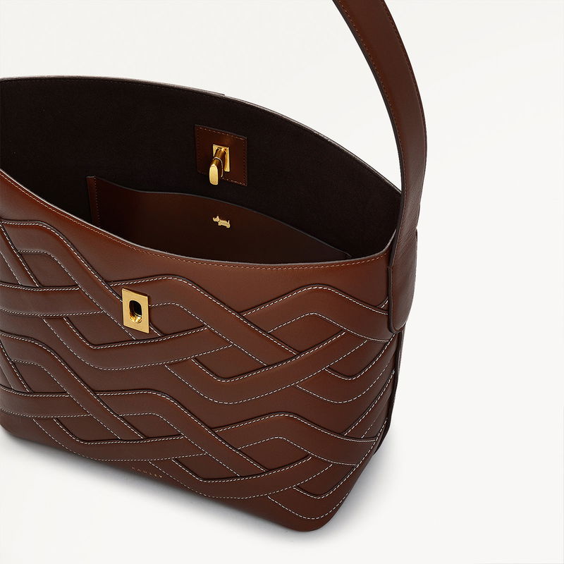 This latest bucket bag, now wrapped in cable knit - inspired padded appliqué. Threadneedle Street is a smart, timeless style made with sleek vegetable - tanned leather and brushed gold - tone hardware. We also love the adjustable shoulder strap and bonded faux suede lining - luxurious final details.