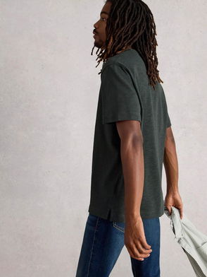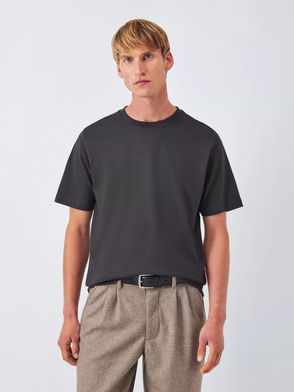 Raey’s rust-brown T-shirt is effortlessly framed to a loose shape and spotlights the label’s nonchalant aesthetic. It’s crafted from airy linen that requires significantly less water and fewer pesticides to produce, then finished with a ribbed crew neckline and dropped shoulders.