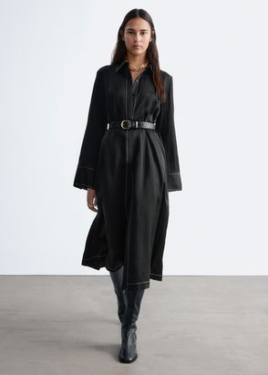 Raey’s black shirt dress is shaped to a relaxed silhouette with a low V-neck framed by notch lapels, cropped dolman sleeves and discreet side slip pockets. It’s made in the UK from airy poplin that’s creased to enhance the laid-back mood and features a detachable belt that cinches the buttoned front.