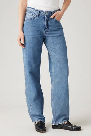 Raey's light blue Fold jeans are cut to a low-rise boyfriend fit for a slouched look. They're made from organic and recycled cotton finished with a subtle wash and whiskering across the thighs, then folded with single pleats at the low-rise waist.
