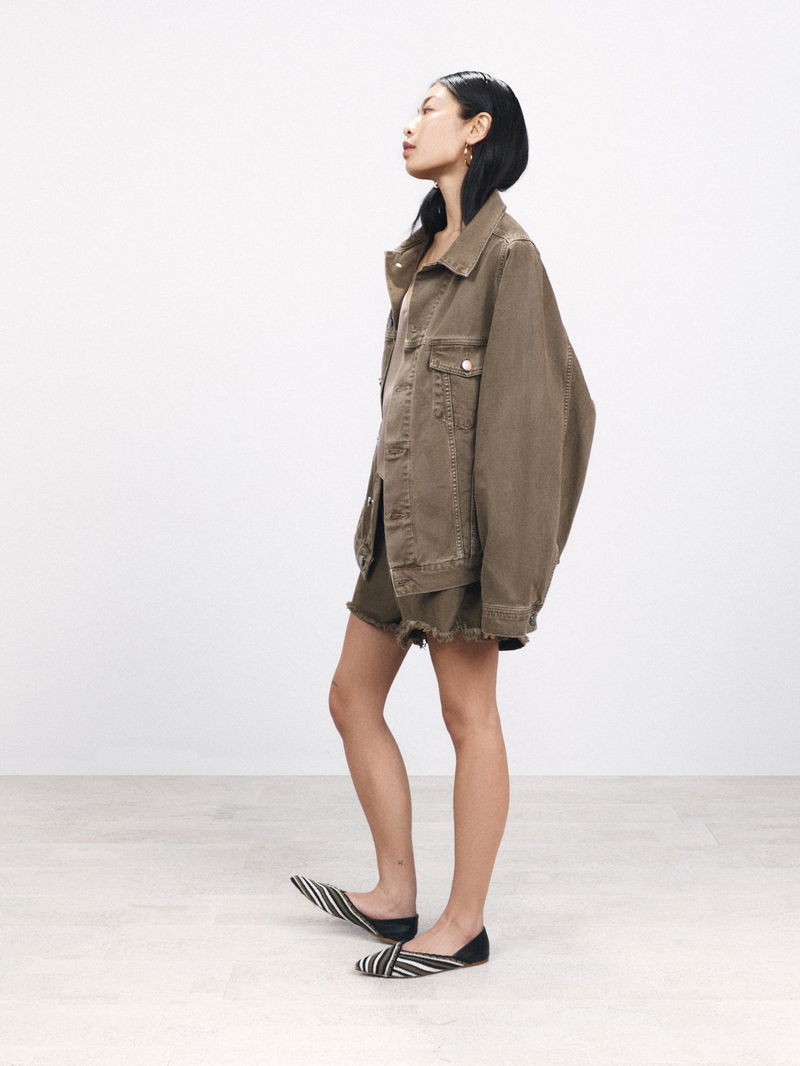 Raey reimagines that classic denim jacket in earthy neutrals for this taupe-brown style, made from organic fibres to an oversized shape with flap pockets.