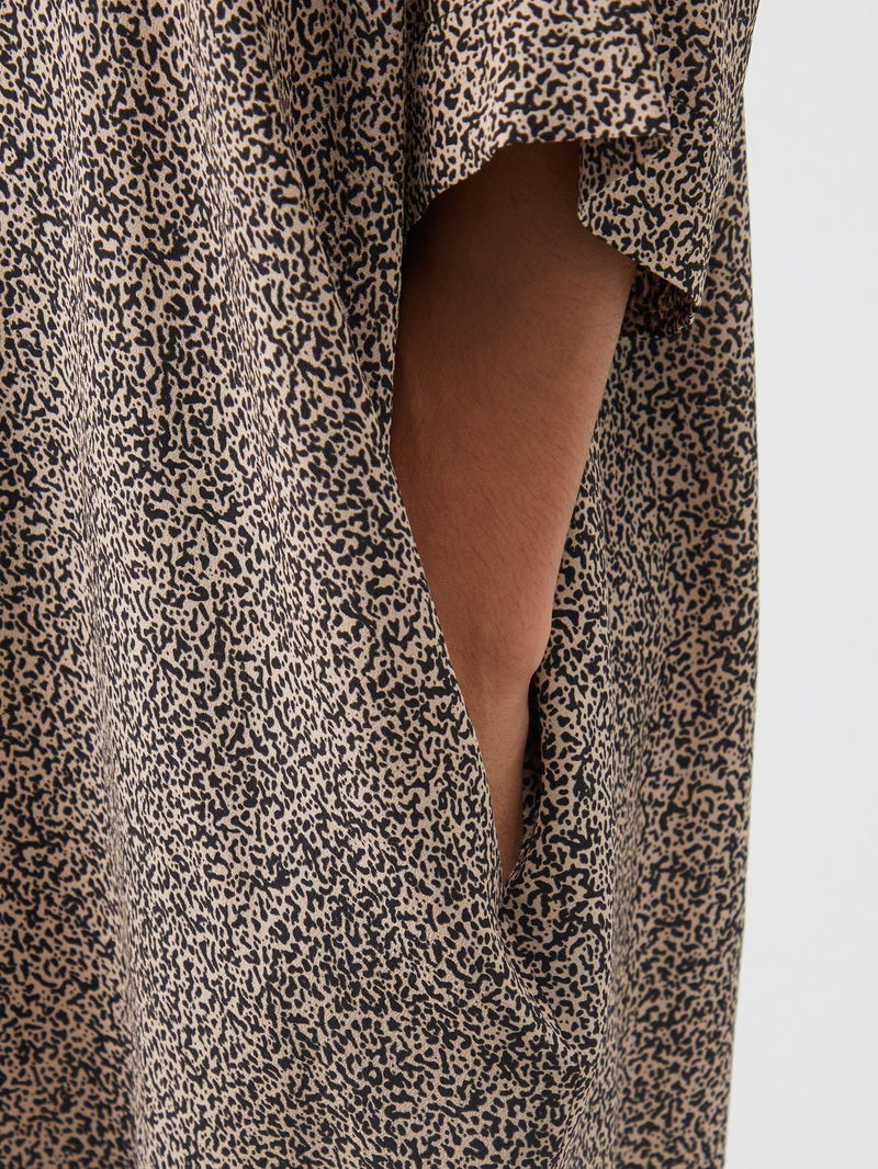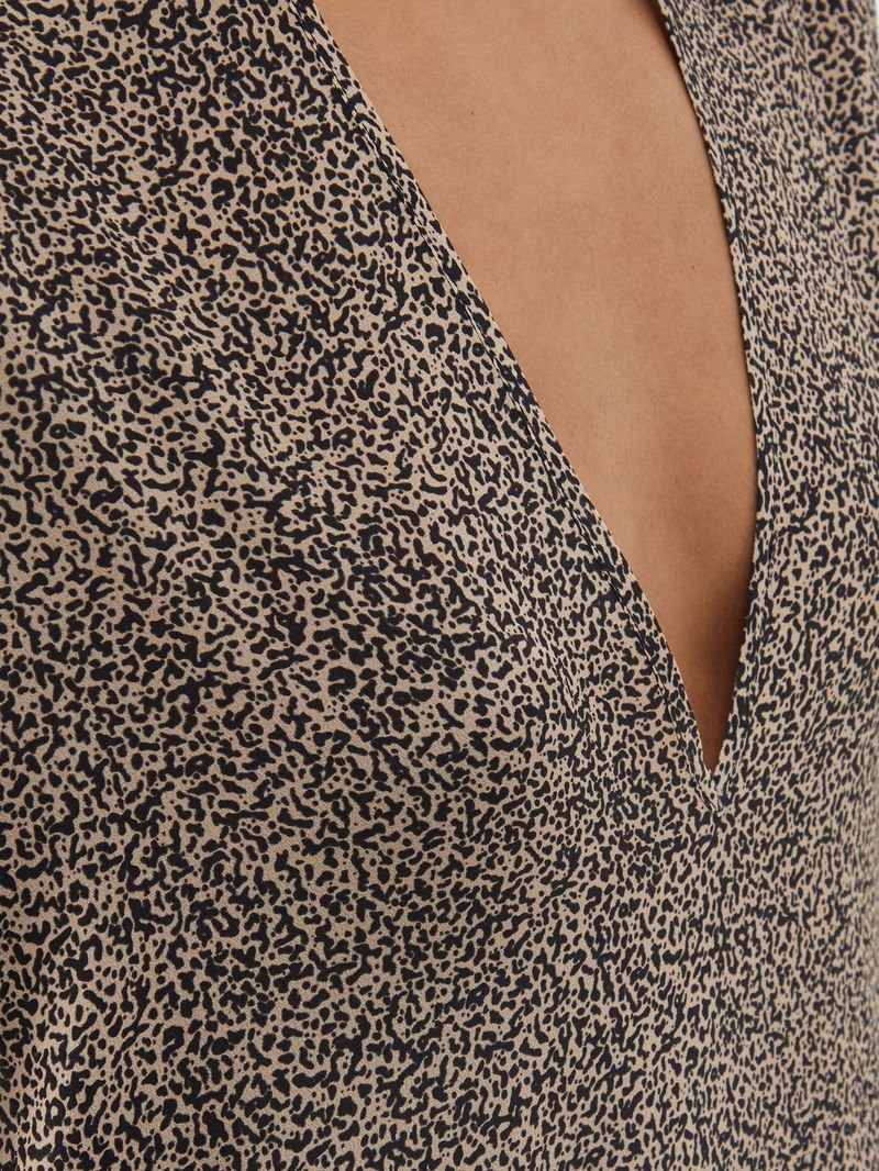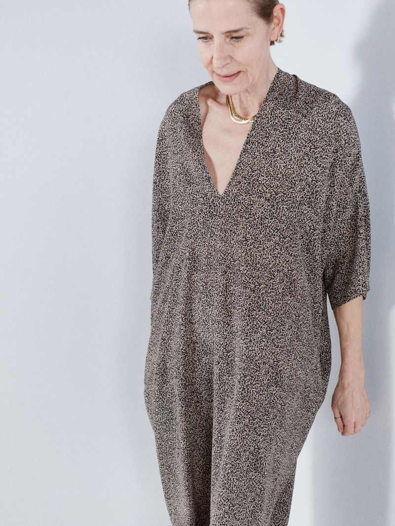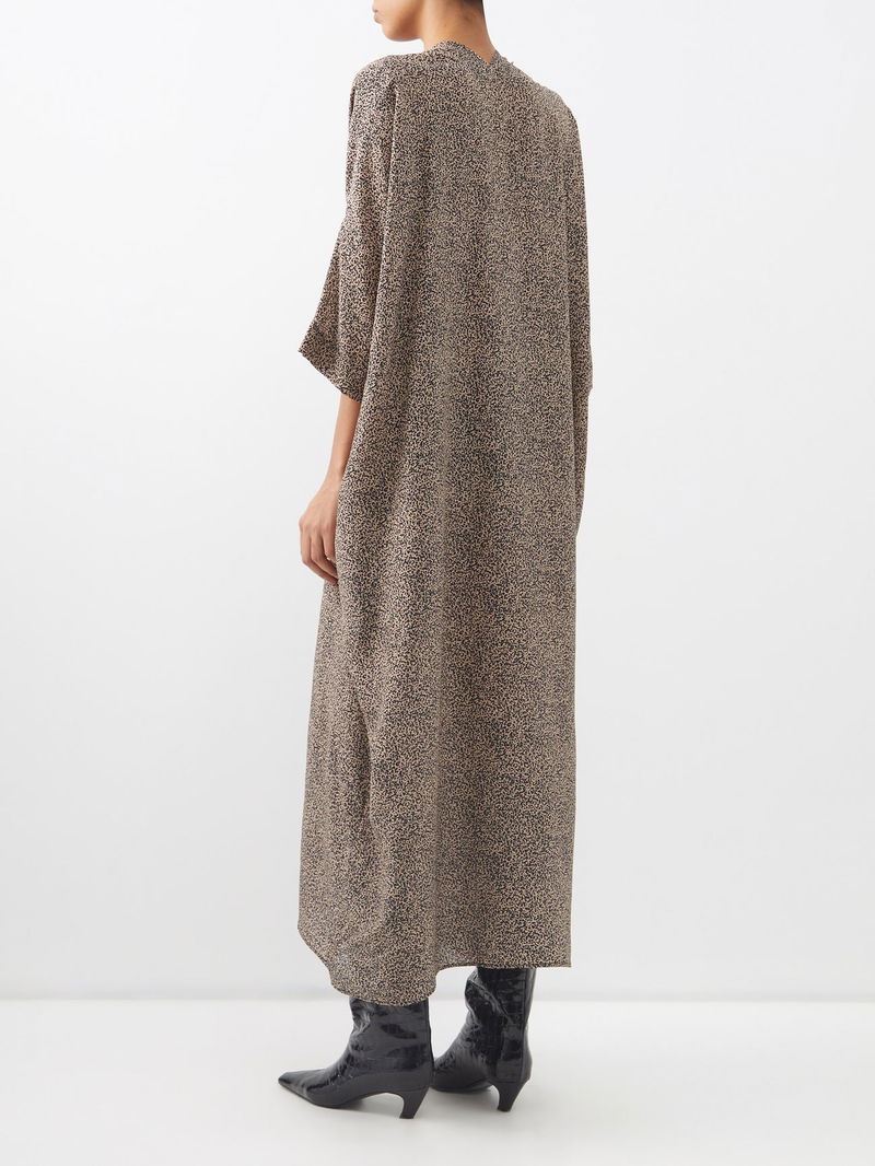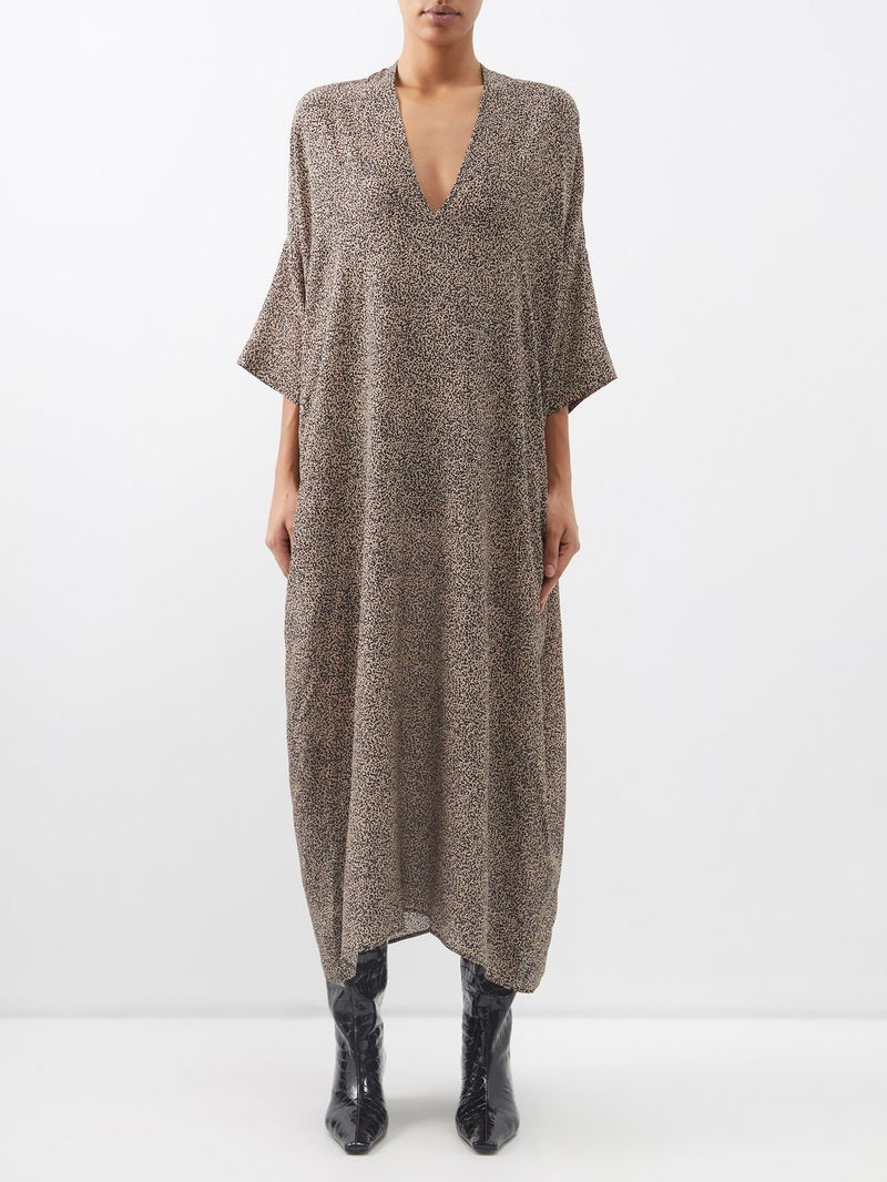 Raey’s navy dress is made in the UK from lightweight silk with a deep V-neckline and an abstract grain print, which gives it a maximalist feel.