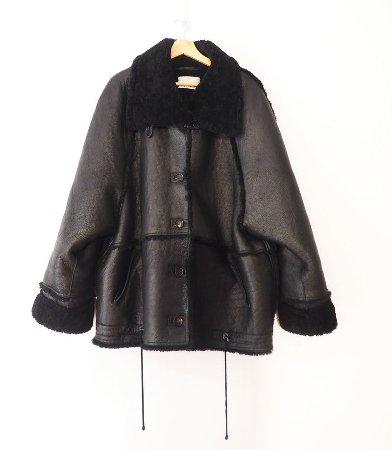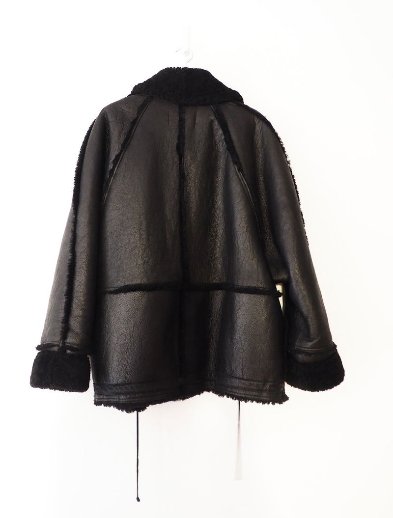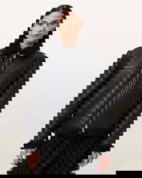 Raey’s black shearling jacket is a contemporary take on a classic pilot silhouette, rendered from smooth leather with raglan sleeves and adjustable at the hem.