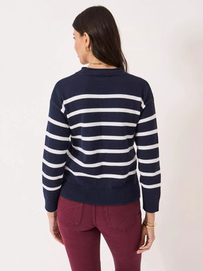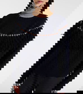 Raey’s dark navy sweater is shaped with a high V-neckline for a contemporary feel. It’s crafted from SustainaWOOL-accredited virgin wool – which ensures all aspects of the production line from animal wellbeing to farm management meet sustainability standards – to an oversized silhouette that’s accentuated by dropped shoulders, then trimmed with ribbed edges.