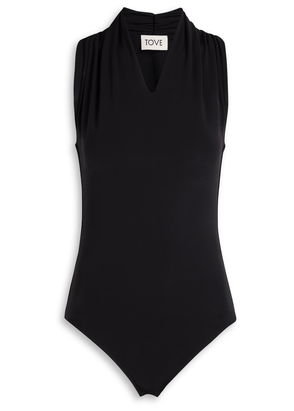 Lustrous silk satin brings a sense of fluidity to Raey's green bodysuit. It's crafted in the UK with a crossover V-neckline and ballooning sleeves, then finished with a comfortable black cotton-blend stretch-jersey base for easy styling.
