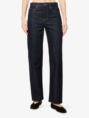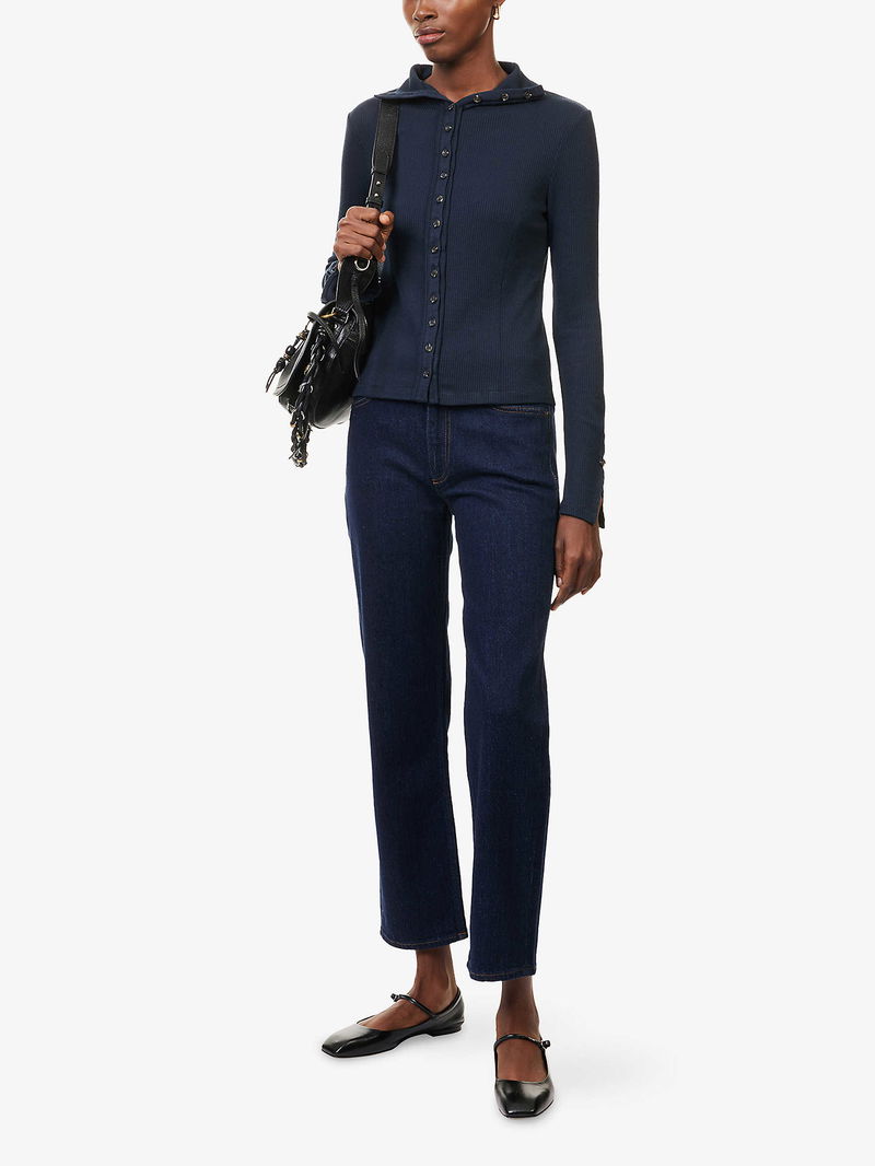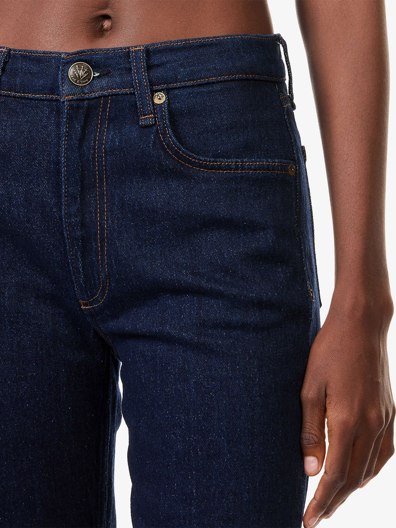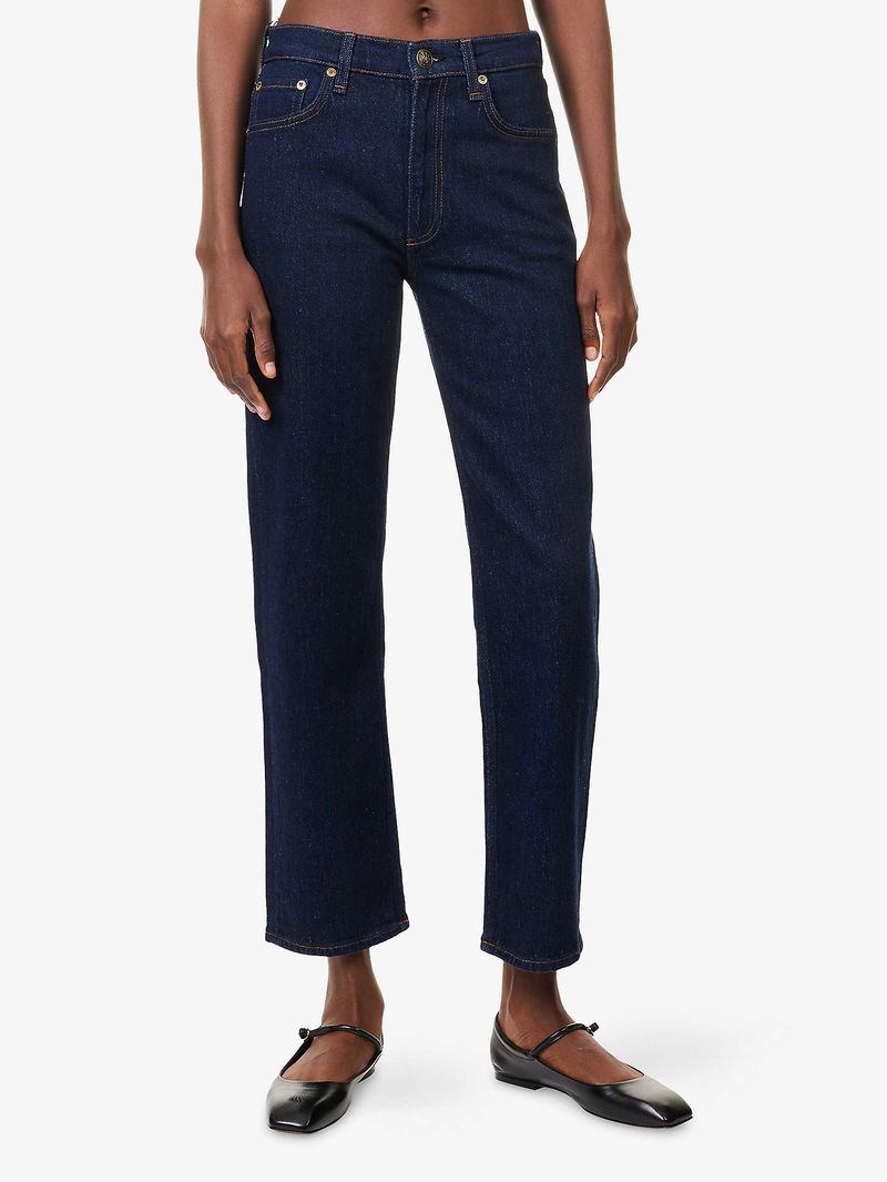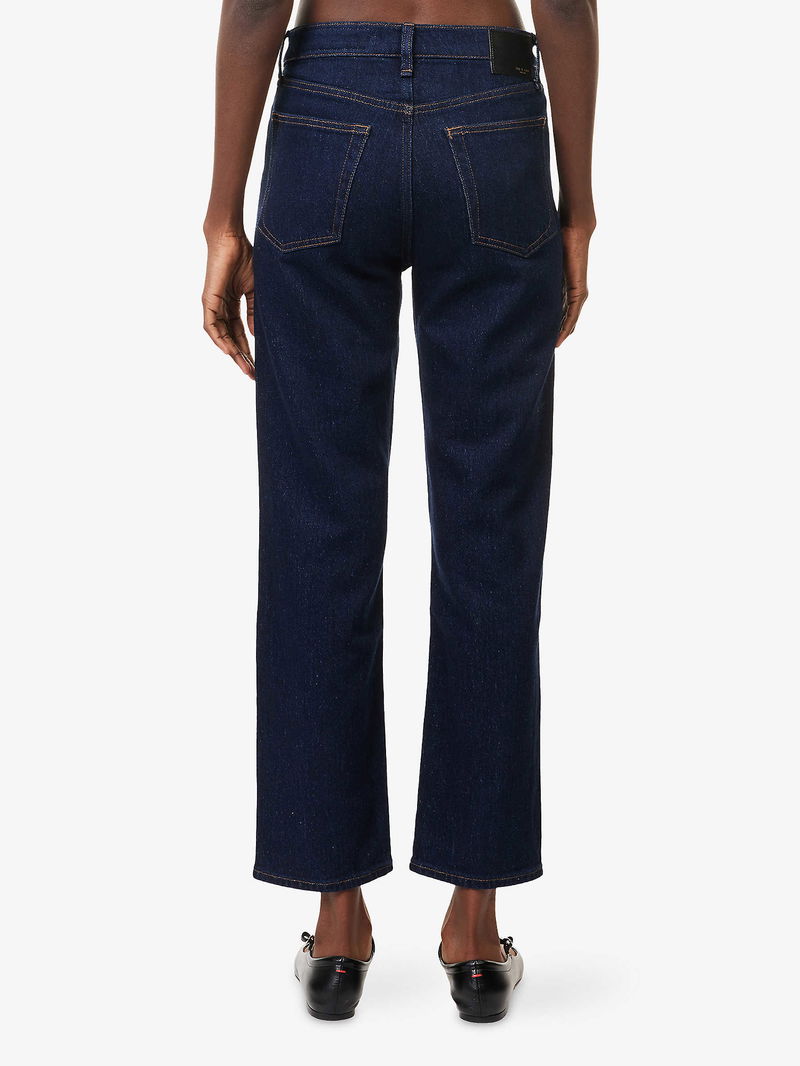 rag & bone denim jeans. Regular fit, mid-rise, straight leg, belt loops, classic five pockets, brand patch at back, embroidered detailing at back, contrast topstitching.