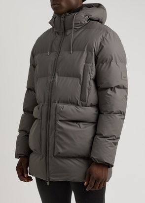 Rains shell coat. Pressed stud fastening. Regular fit, drawstring hood, long sleeves, flap pockets at front, brand tab at side, belted waist, coated texture, branded silver-toned hardware.