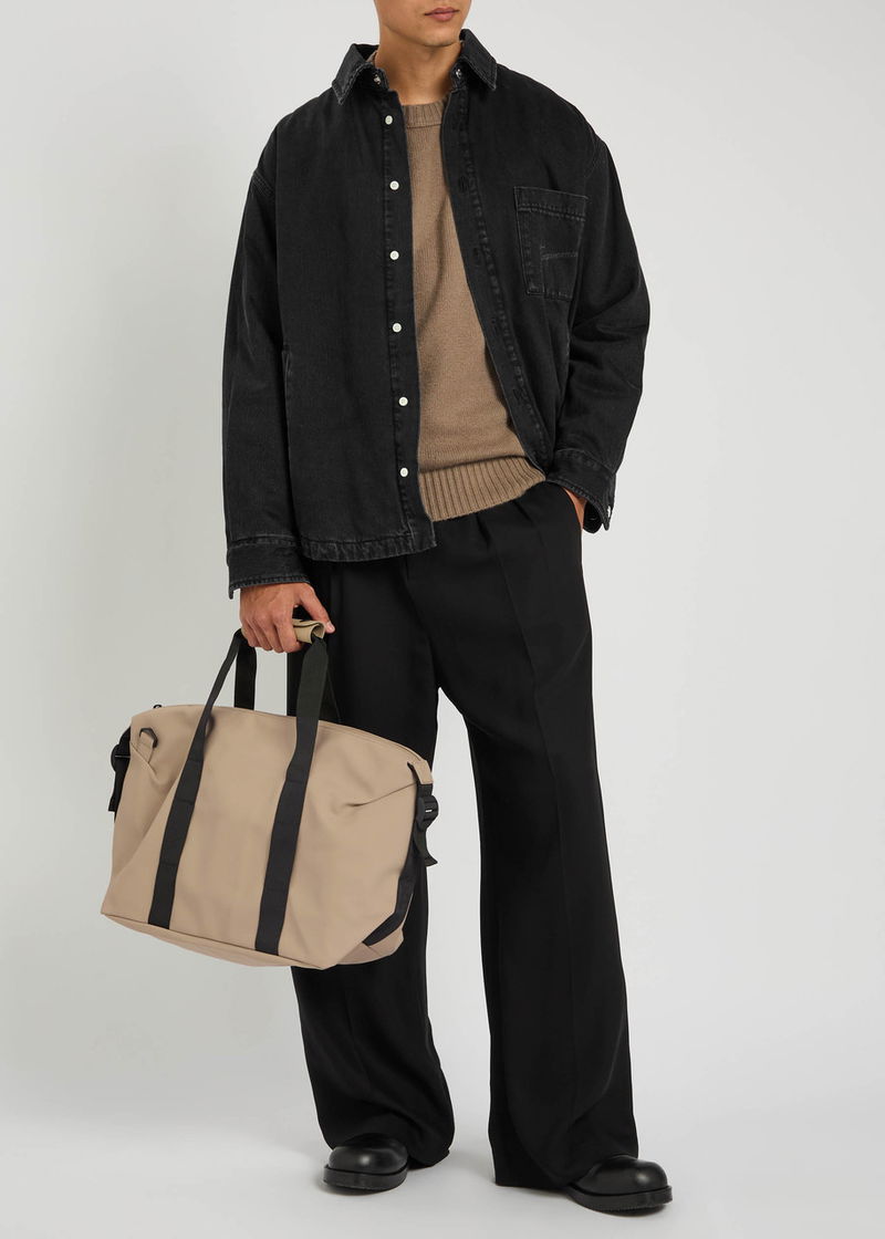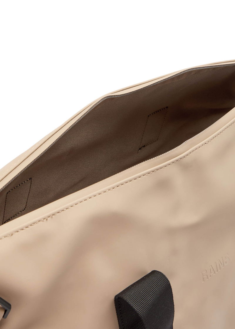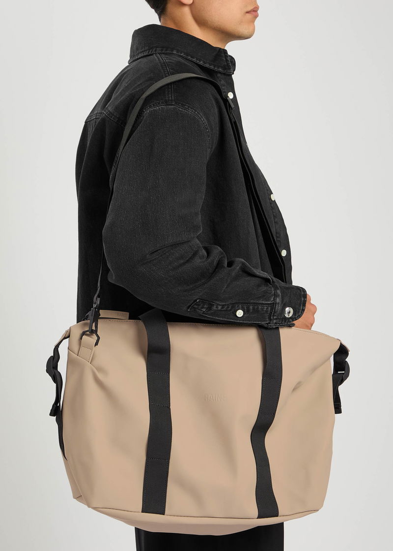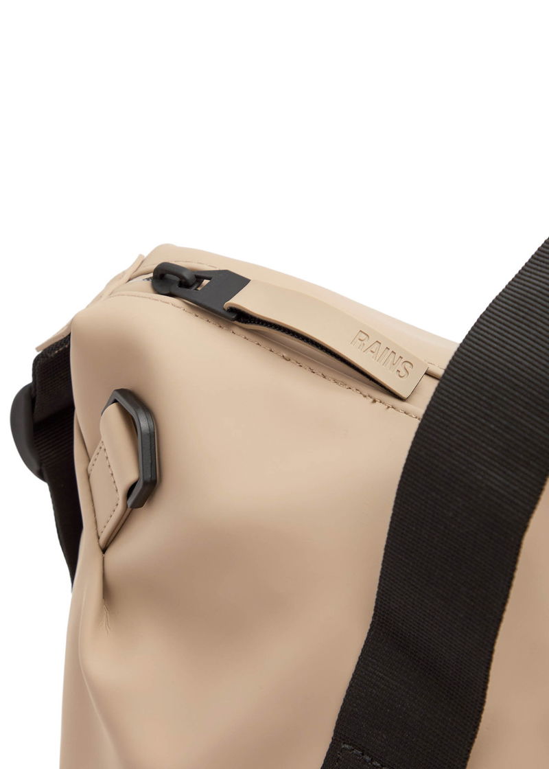 Rains waterproof holdall. Two canvas top handles with press-stud fastening strap, waterproof, detachable canvas shoulder straps, debossed logo, adjustable canvas straps at sides, fully lined.