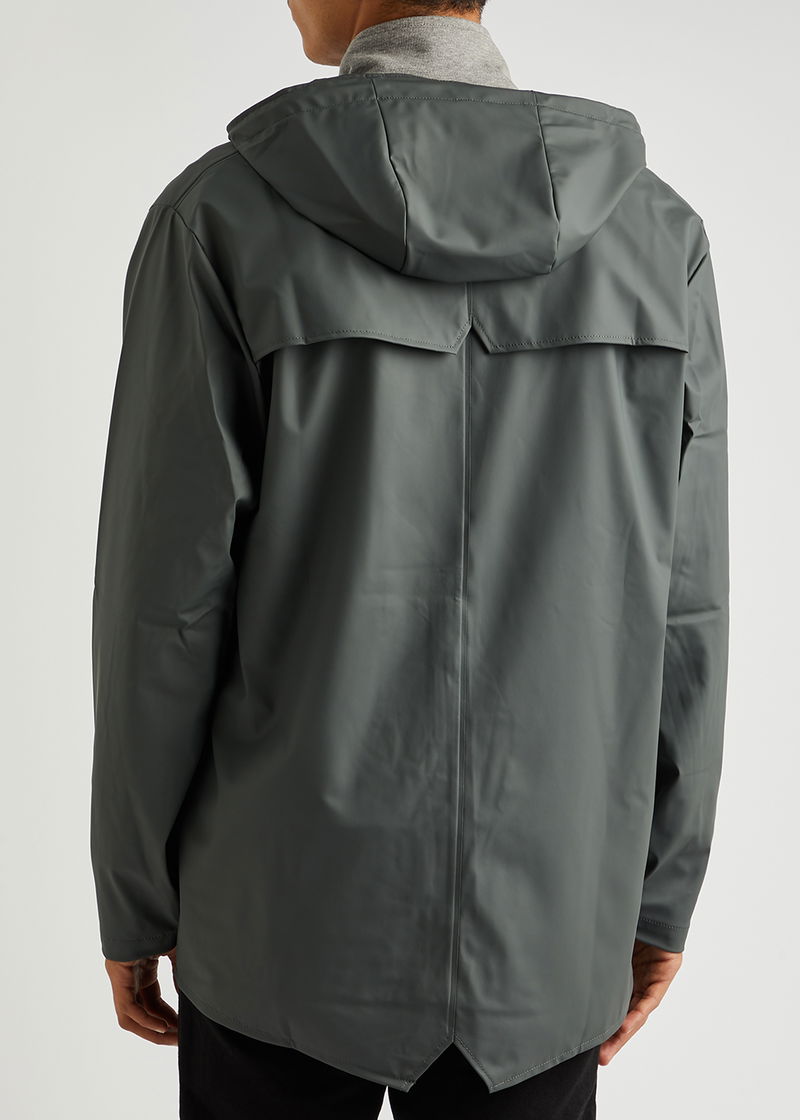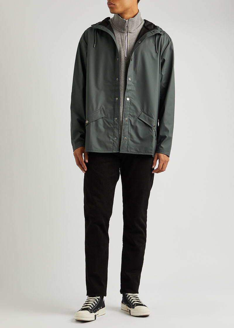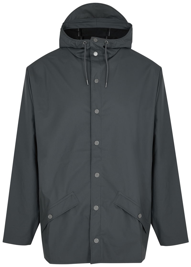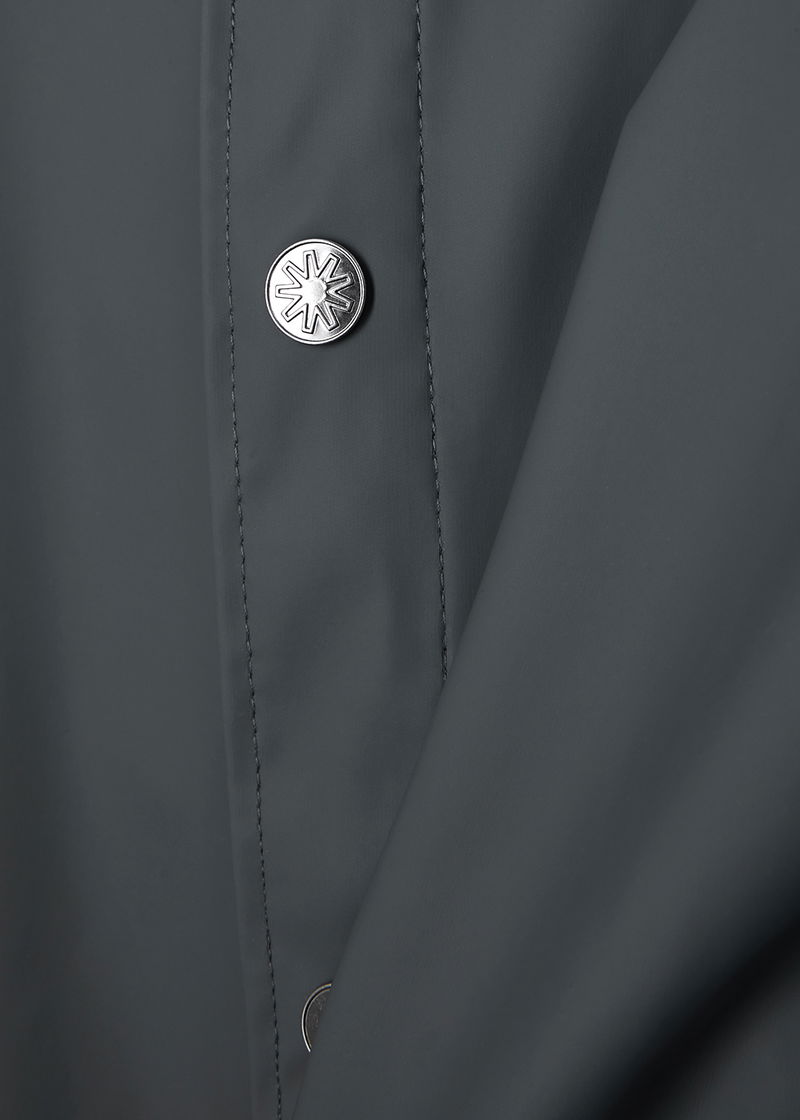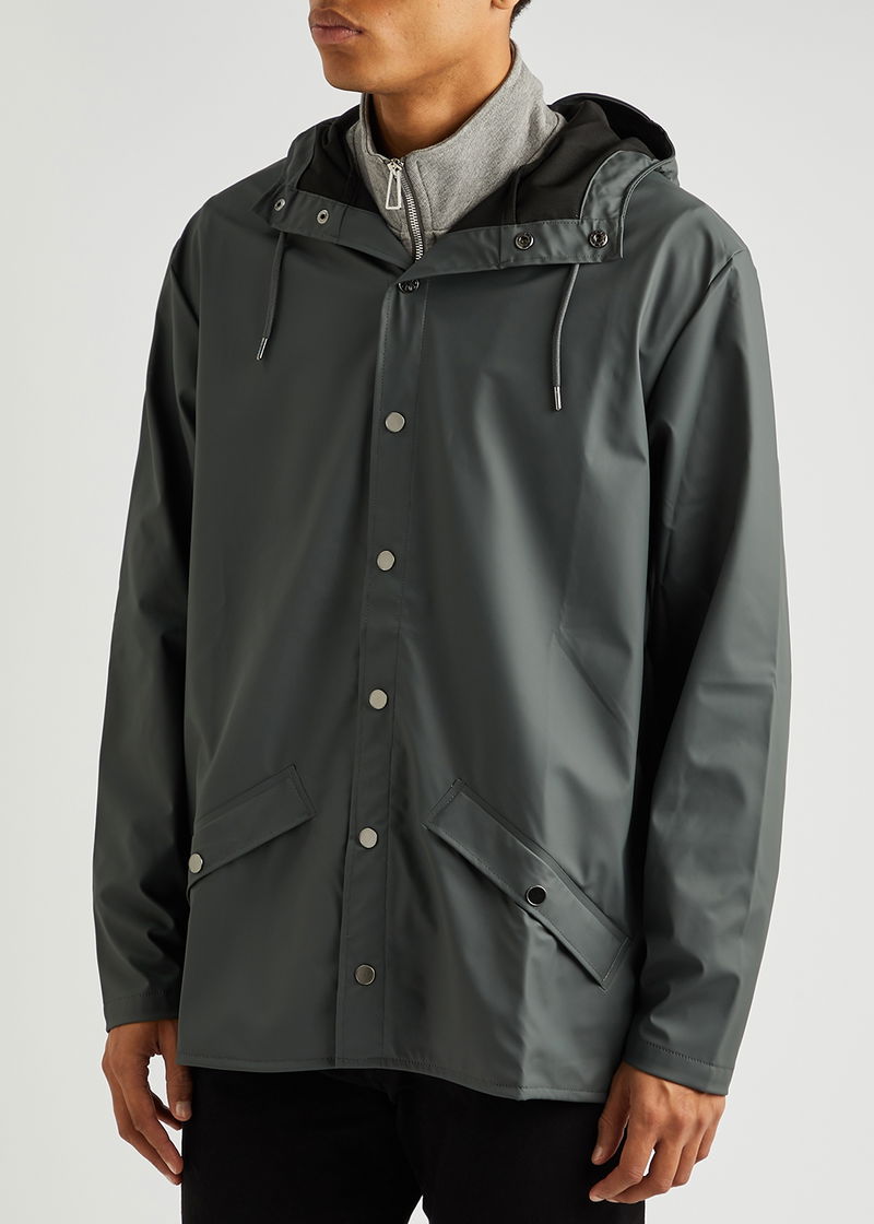 Rains rubberised raincoat. Water-resistant, drawstring hood with peak, high-neck, slightly dropped shoulders, double-welded press-stud fastening side pockets, press stud-fastening cuffs, underarm ventilation eyelets, back storm flap with concealed ventilation cut-outs, longer back hem, back vent, welded seams Press stud fastenings through front.